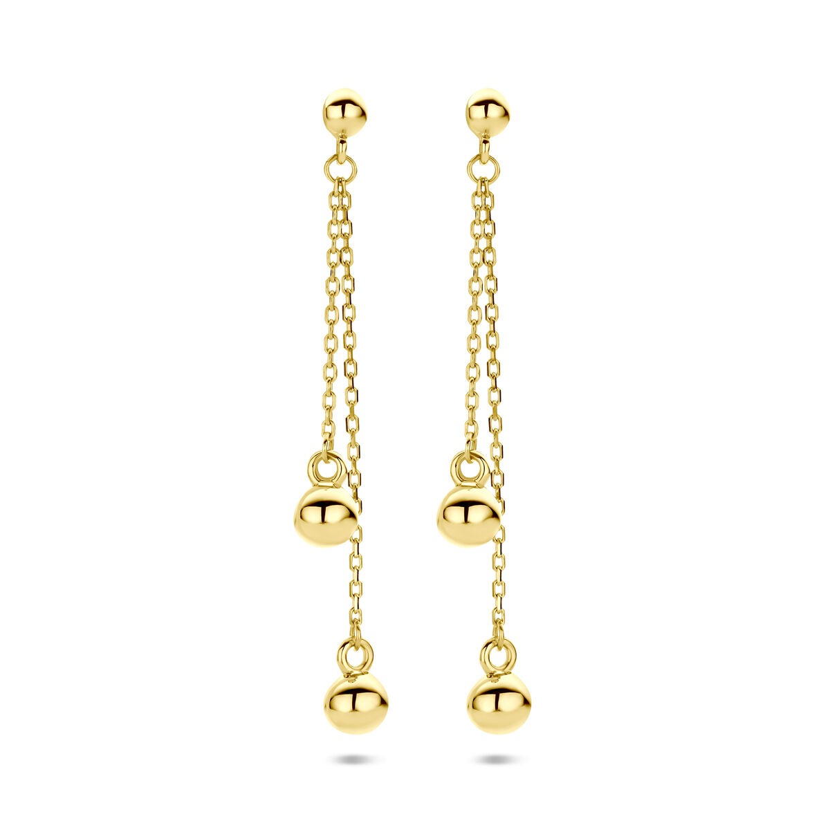 eze 14 karaat geelgouden oorhangers zijn een verfijnde blikvanger met speelse elegantie. Het ontwerp bestaat uit subtiele bolvormige elementen die harmonieus in lengte zijn verwerkt tot een luchtige compositie van 35 mm hoog. De warme glans van het geelgoud zorgt voor een luxe uitstraling, terwijl de verfijnde vormen een moderne, vrouwelijke touch toevoegen.