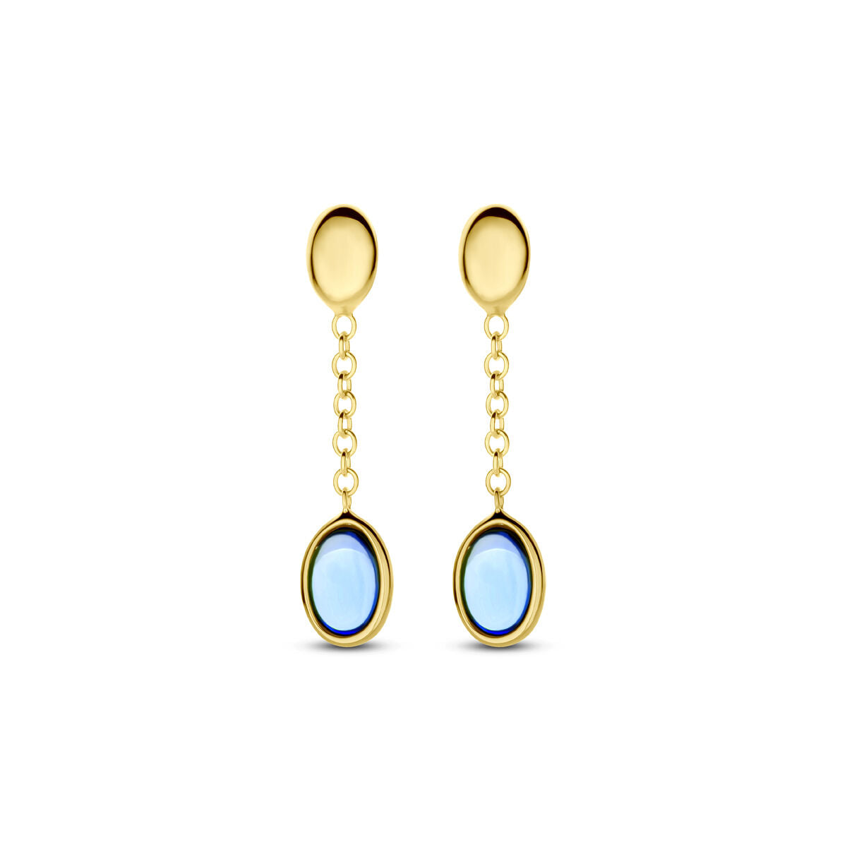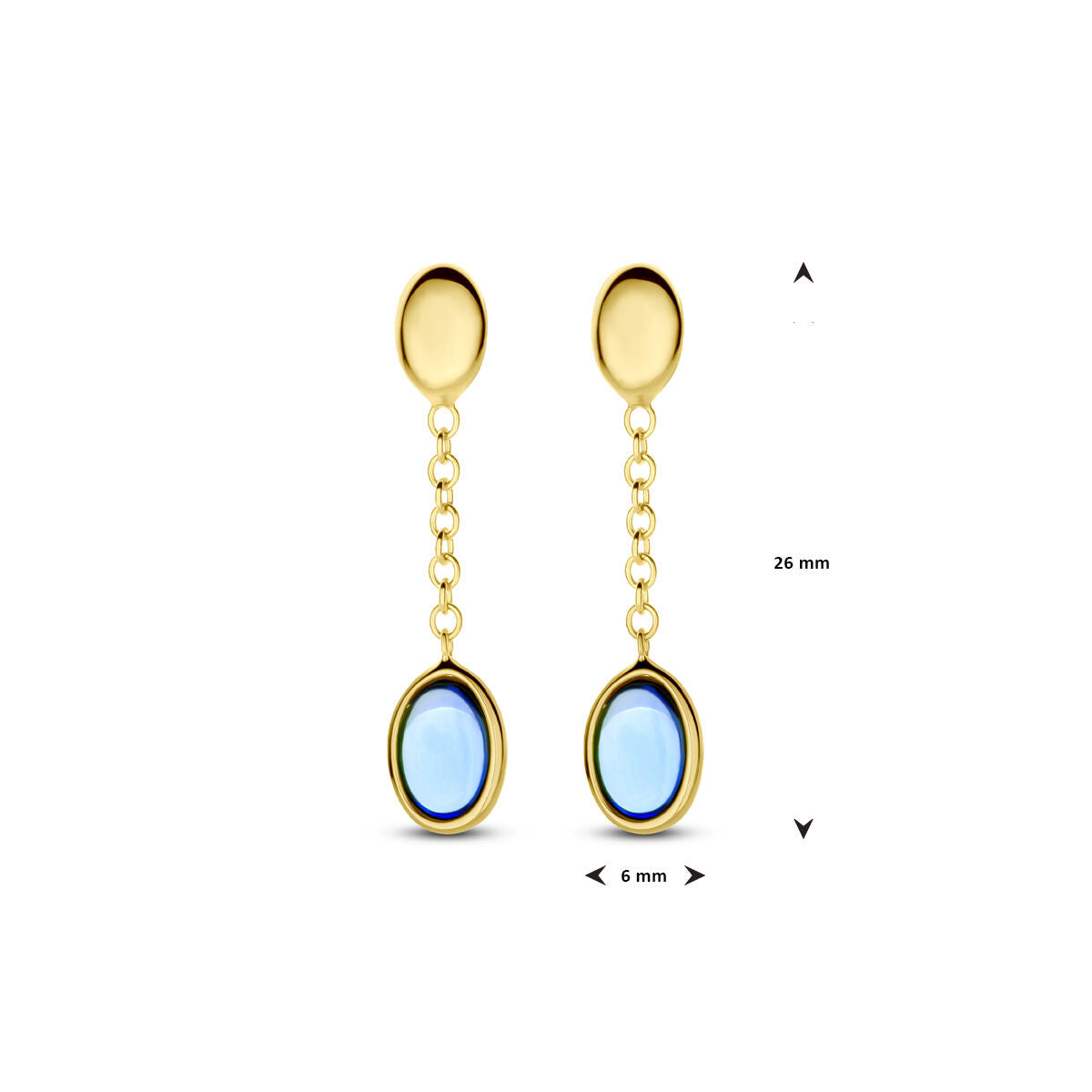 Van der Kooij Collectie oorhangers london blue topaas 26 mm, vervaardigd uit 14K geelgoud met ovale blauwe topaas aan korte ketting en gouden steker, gepresenteerd tegen een witte achtergrond.