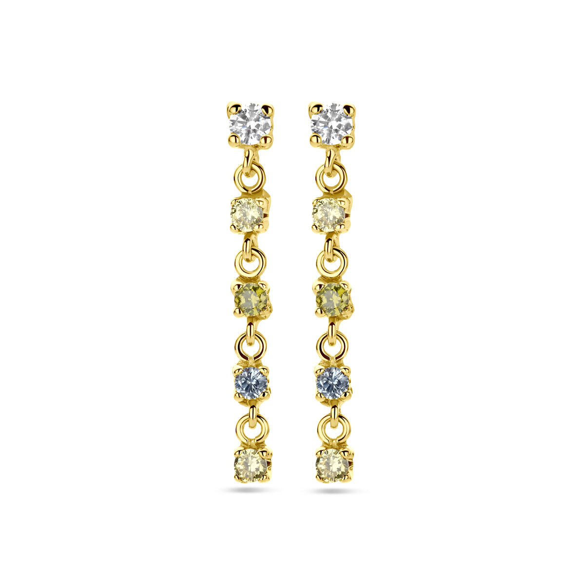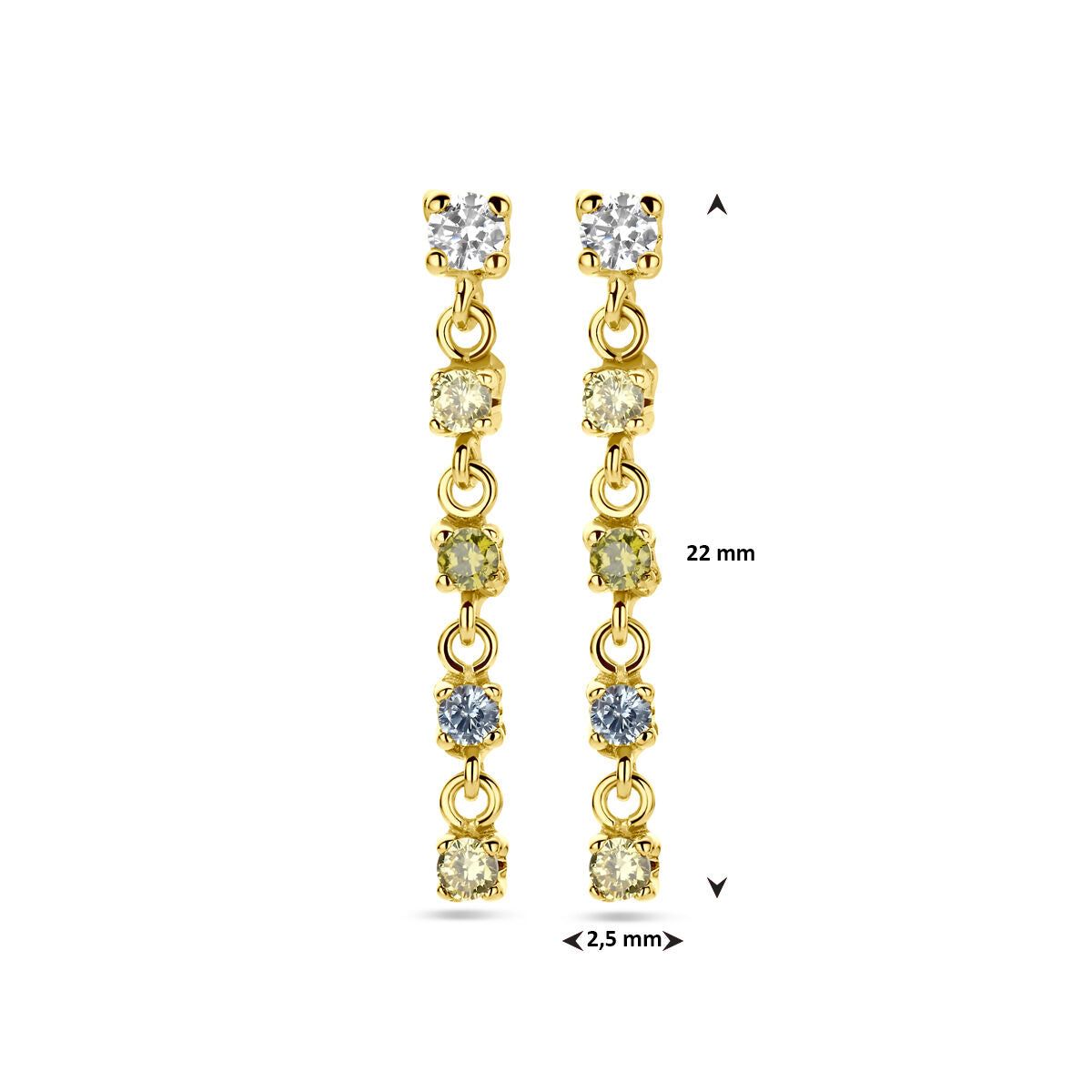 14k Geelgouden oorhangers uitgevoerd met wit, geel en groen zirkonia en synthetisch aquamarijn. De oorhangers hebben een totale hoogte van 22mm.