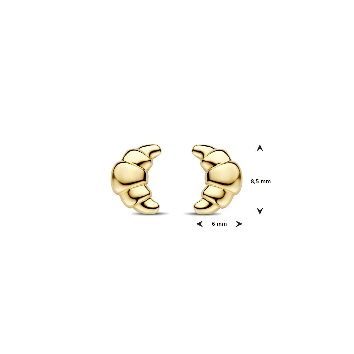 14k Geelgouden oorknoppen uitgevoerd in de vorm van een croissant. De oorknoppen hebben een afmeting van 8.5x6mm.