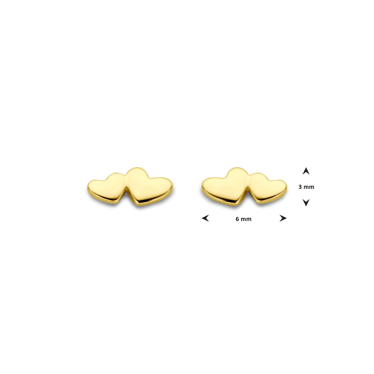 14k Geelgouden oorknoppen uitgevoerd met hartjes. De oorknoppen hebben een afmeting van 3x6mm.