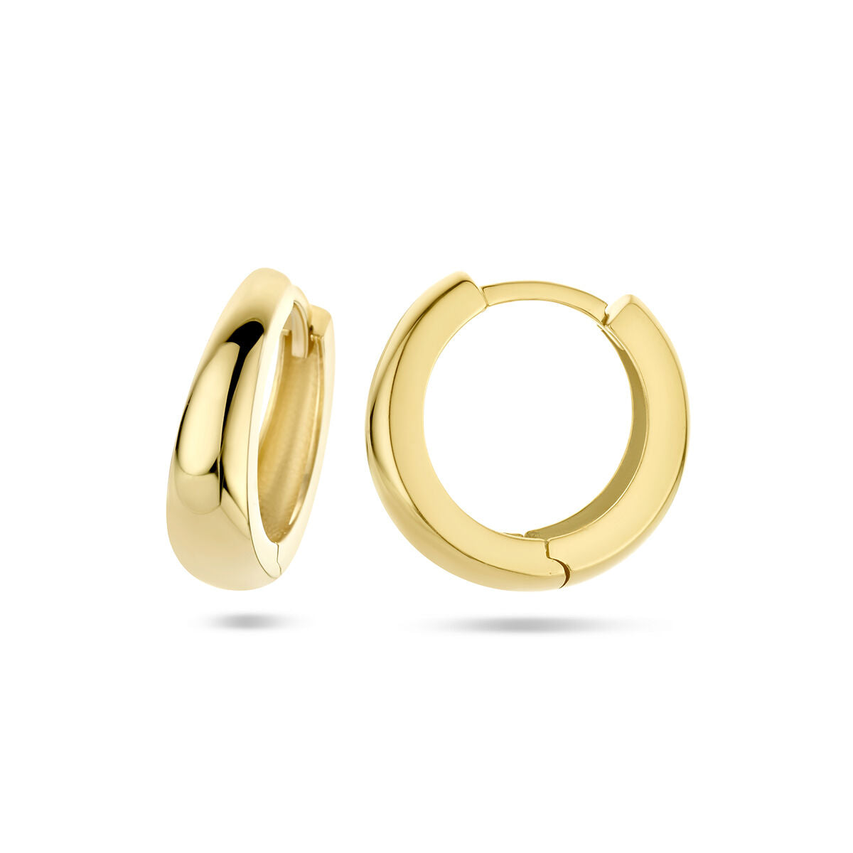 De Van der Kooij Collectie klapoorringen 14K geelgoud voor dames zijn kleine, dikke hoepels van 13,5 mm hoog en 4 mm breed, afgebeeld tegen een witte achtergrond.