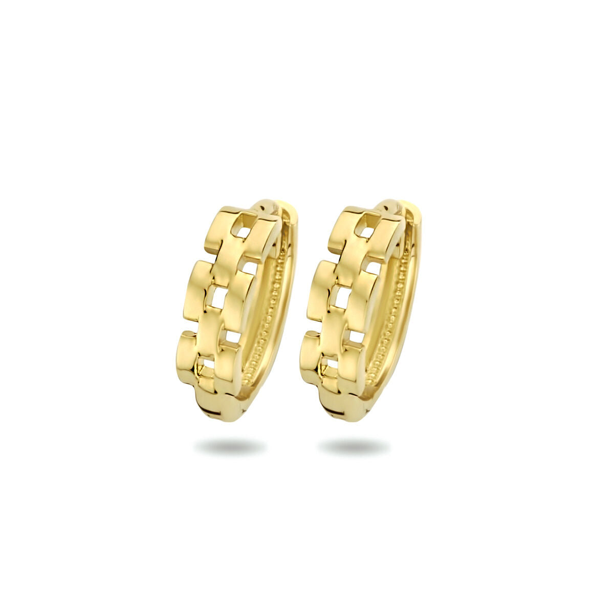 14k yellow gold drop earrings with a link motif. The earrings have a diameter of 12.5mm and a thickness of 3.5mm.
