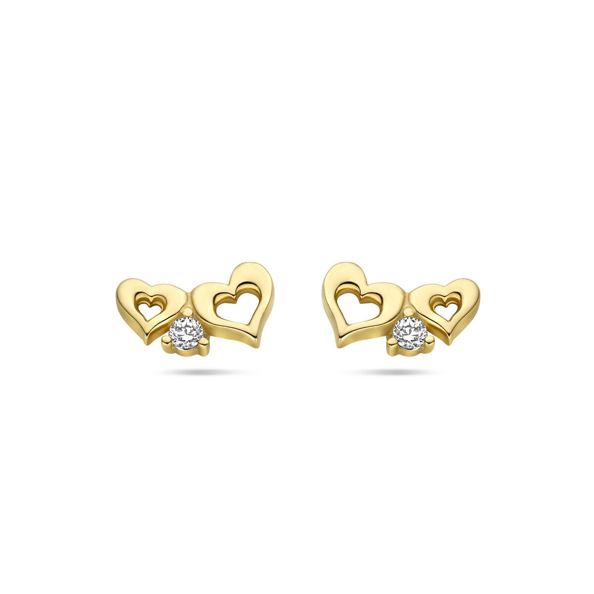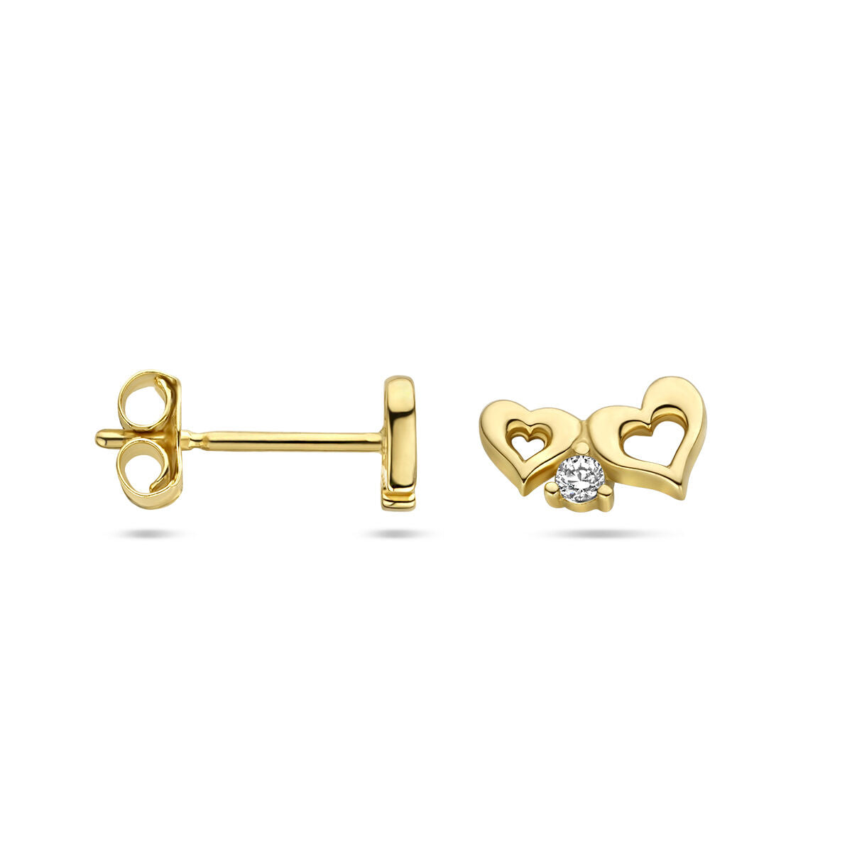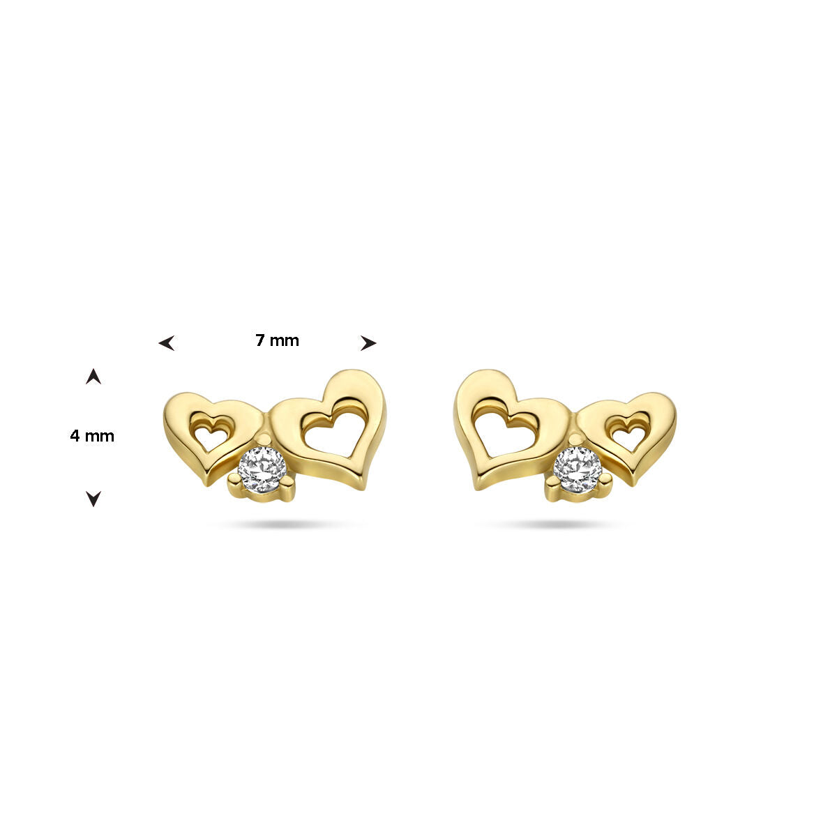 14k yellow gold stud earrings with hearts and zirconia. The ear studs have a size of 4x7mm.
