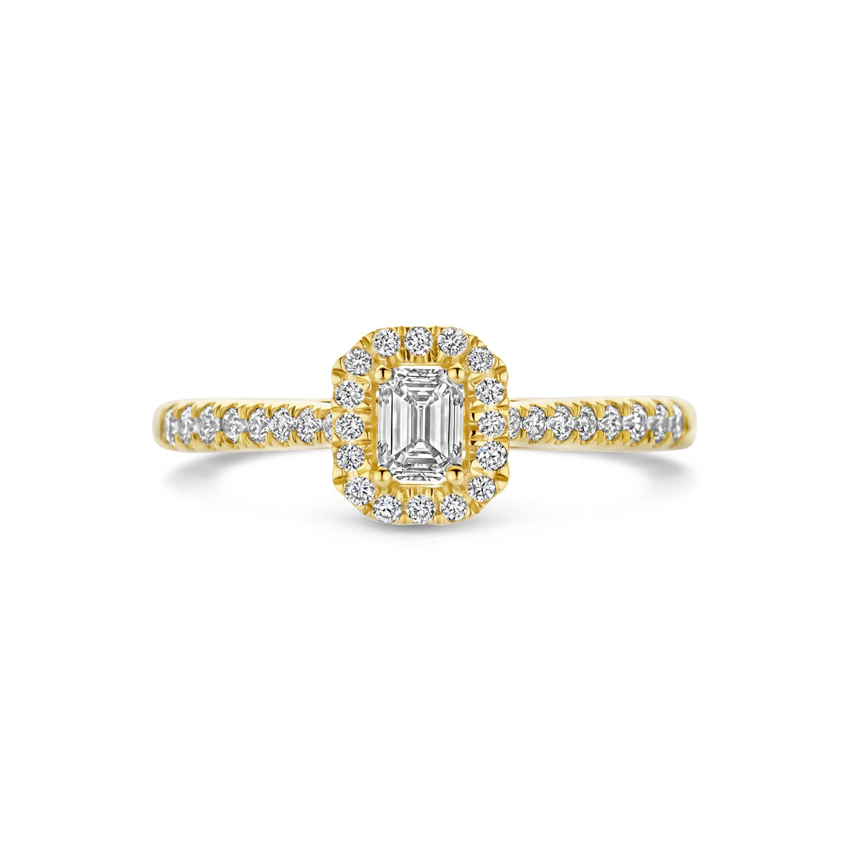 De Van der Kooij Collectie ring lab grown diamant 0.48ct h si 14K geelgoud heeft een rechthoekige lab-grown diamant met een halo van kleinere diamanten en extra diamanten op de band, afgebeeld op een witte achtergrond.