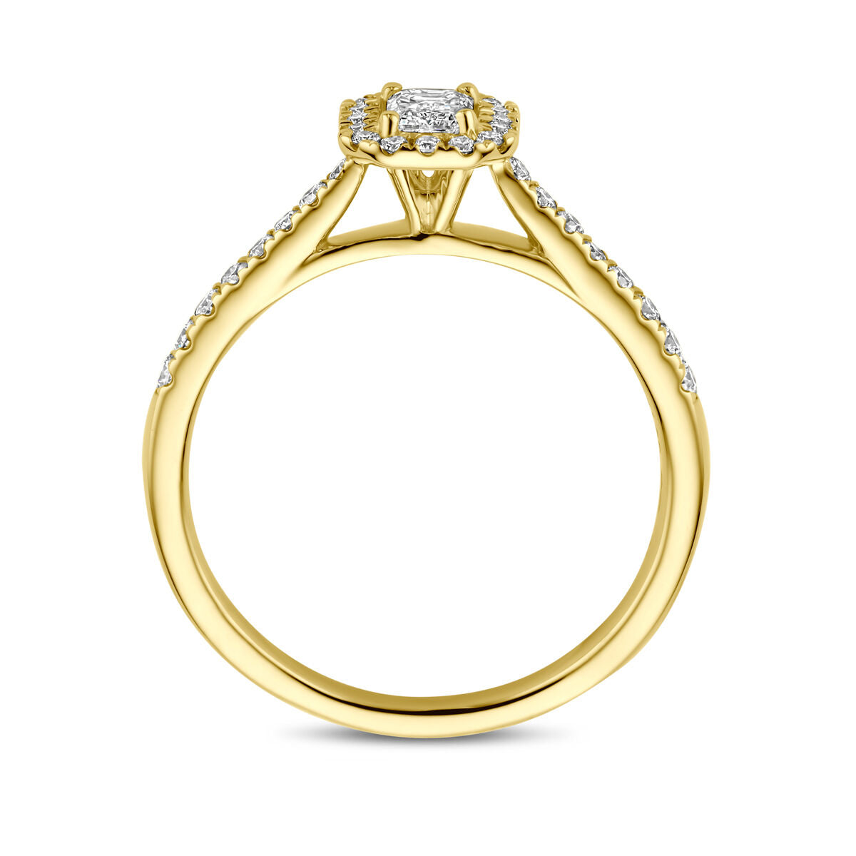 De Van der Kooij Collectie ring lab grown diamant 0,48ct h si 14K geelgoud heeft een rechthoekig lab-grown diamanten centrum met een halo van ronde diamanten en diamant geaccentueerde band; centrum zetting is 7x6,5 mm.
