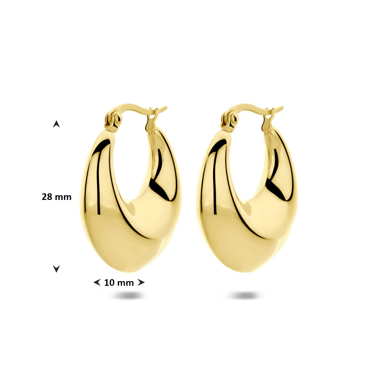 Deze goudkleurige stalen oorringen van 28 x 10 mm maken een krachtig en stijlvol statement. De ovale vorm en de brede, gladde afwerking geven het ontwerp een moderne en elegante uitstraling, perfect voor zowel een alledaagse look als een avond vol allure.