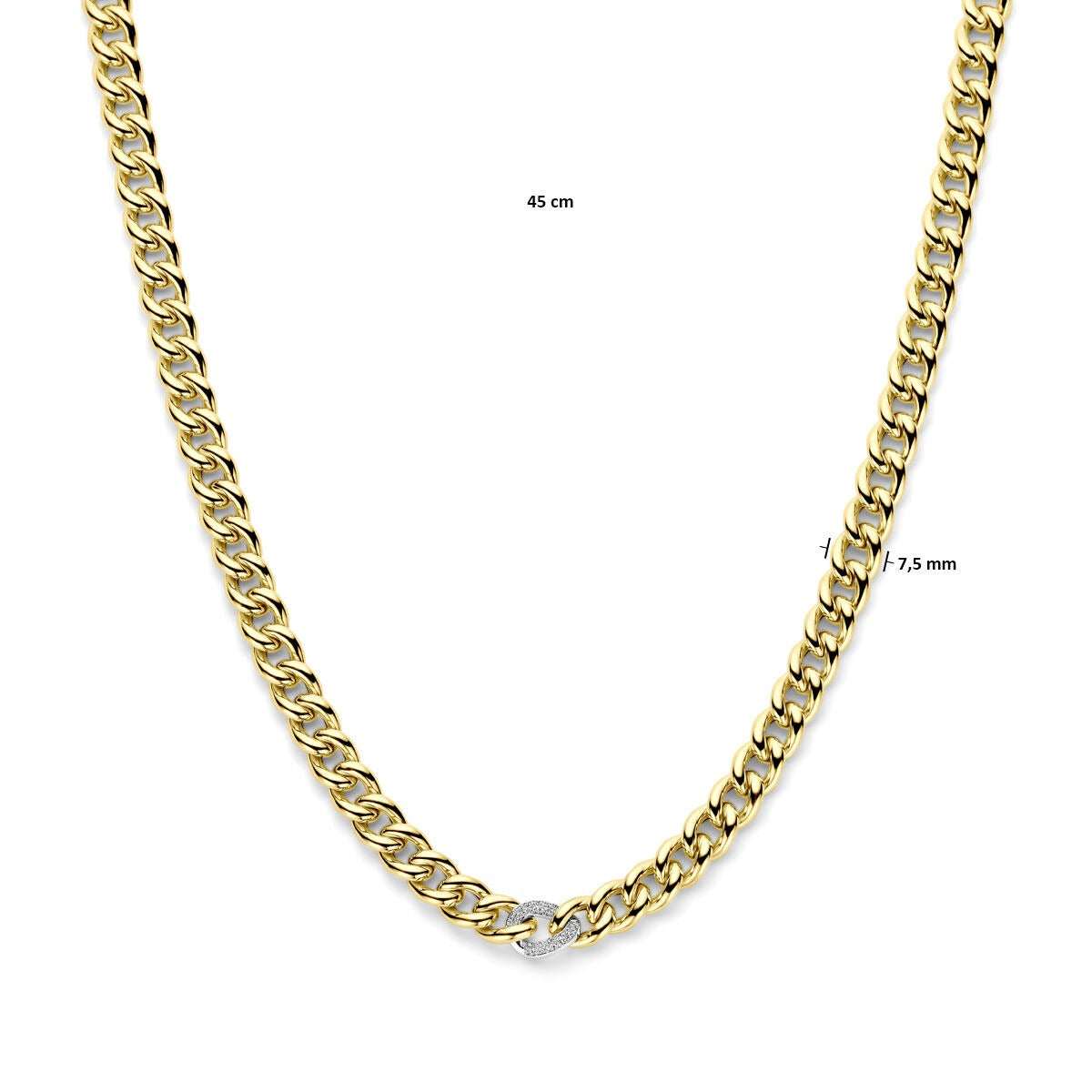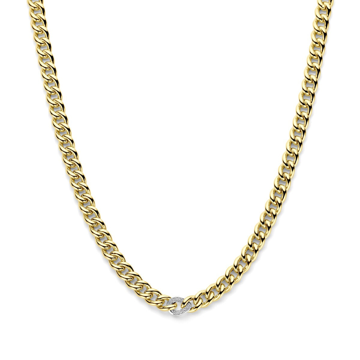 Dit exclusieve collier is vervaardigd van 14 karaat bicolor goud, waarin warm geelgoud en elegant witgoud op harmonieuze wijze samenkomen. De klassieke gourmette schakel krijgt een luxueuze uitstraling door de verfijnde pavézetting met briljant geslepen diamanten. Met een totaal diamantgewicht van 0,12 karaat ontstaat een subtiele, maar sprankelende schittering die het collier een tijdloos en stijlvol karakter geeft.