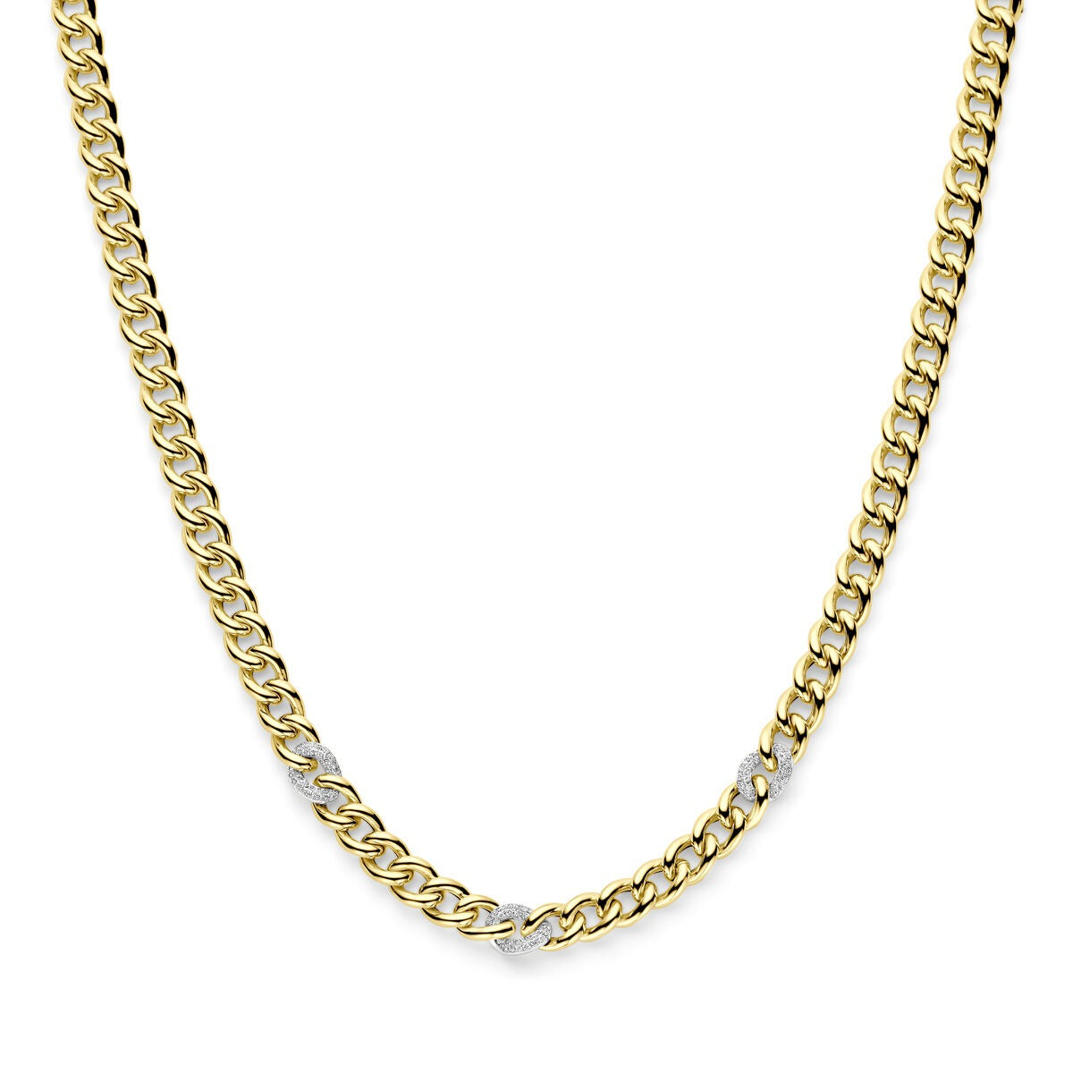 Dit luxueuze collier is vervaardigd van 14 karaat bicolor goud, waarin warm geelgoud en elegant witgoud op harmonieuze wijze samenkomen. De klassieke gourmette schakel vormt een krachtige basis, verfijnd met schitterende briljant geslepen diamanten die in pavézetting zijn geplaatst. Met een royaal totaal diamantgewicht van 0,31 karaat straalt dit collier pure elegantie en vakmanschap uit, waarbij iedere beweging wordt begeleid door een subtiele, maar rijke fonkeling.
