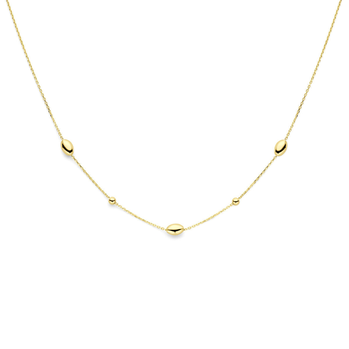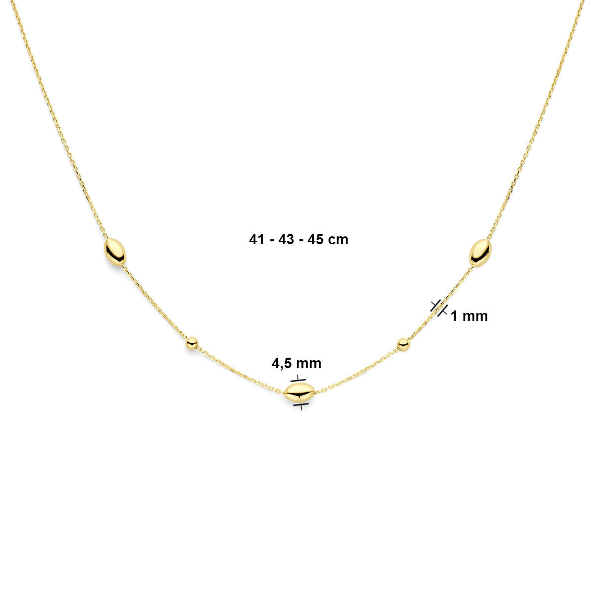 14k yellow gold necklace with ovals and balls. The necklace has wearing lengths of 41, 43 and 45cm.