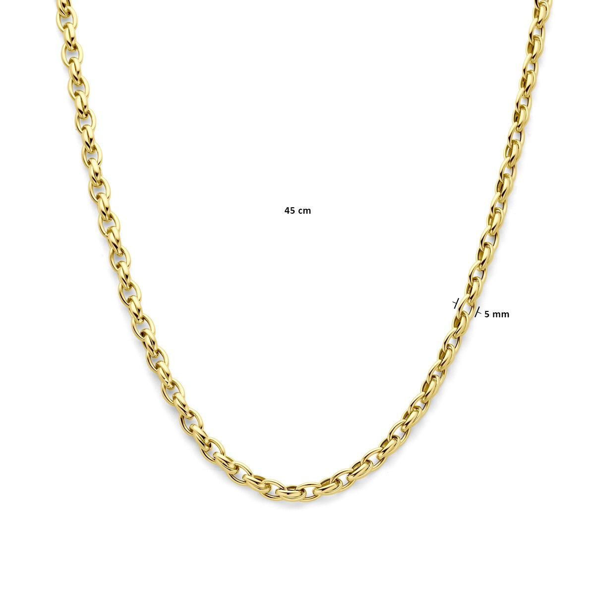 Dit 9k geelkleurig collier is een krachtig en stijlvol statement binnen onze collectie Gouden kettingen. Met een draaglengte van 45 cm valt het collier elegant rond de hals, terwijl de fantasie schakel van 5 mm breed zorgt voor een speels en eigentijds karakter. De bijzondere schakels geven het ontwerp een unieke uitstraling en laten het licht subtiel weerkaatsen bij iedere beweging.