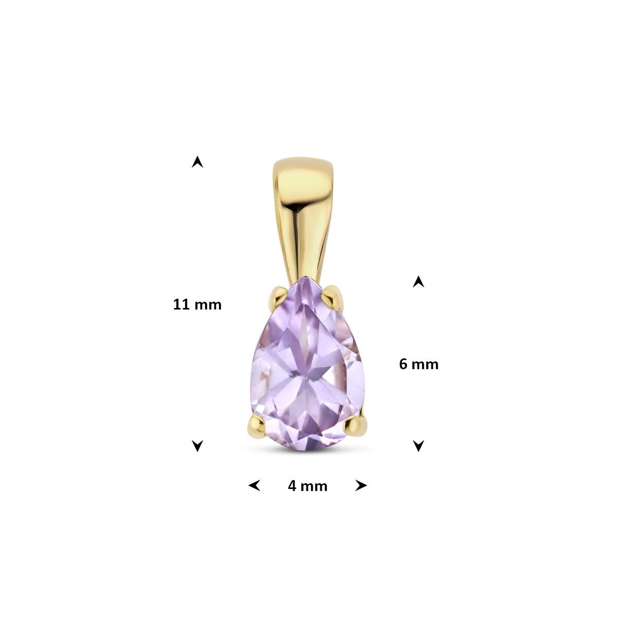 Deze 14 karaat geelgouden hanger is een verfijnd en vrouwelijk sieraad, uitgevoerd met een elegant peervormige amethist van 6 x 4 mm. De rijke paarse kleur van de amethist straalt rust en verfijning uit, terwijl de chatonzetting met vier pootjes de steen stevig omlijst en haar schittering prachtig naar voren laat komen.