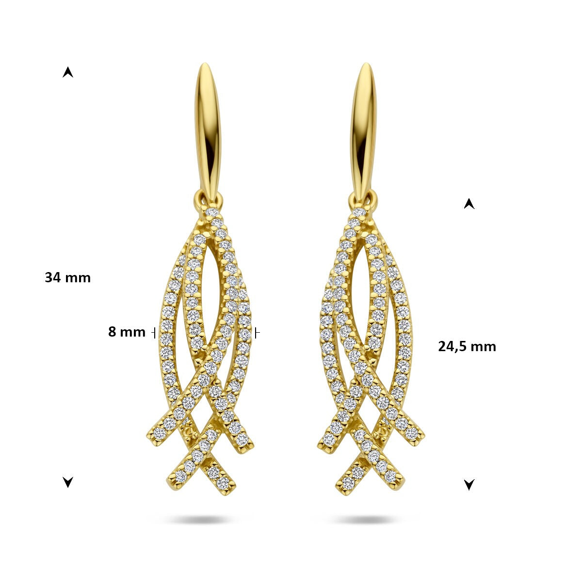 Deze 14 karaat geelgouden oorhangers zijn een schitterend toonbeeld van luxe en verfijning. Met een totale lengte van 34 mm en een breedte van 8 mm vallen de oorhangers elegant langs het gezicht, terwijl een schitterende rij van briljant geslepen diamanten (totaal 0.50 ct, SI2) het licht vangen bij elke beweging. De diamanten zijn zorgvuldig geplaatst in een verfijnde rijzetting, wat zorgt voor maximale sprankeling en een tijdloze uitstraling.