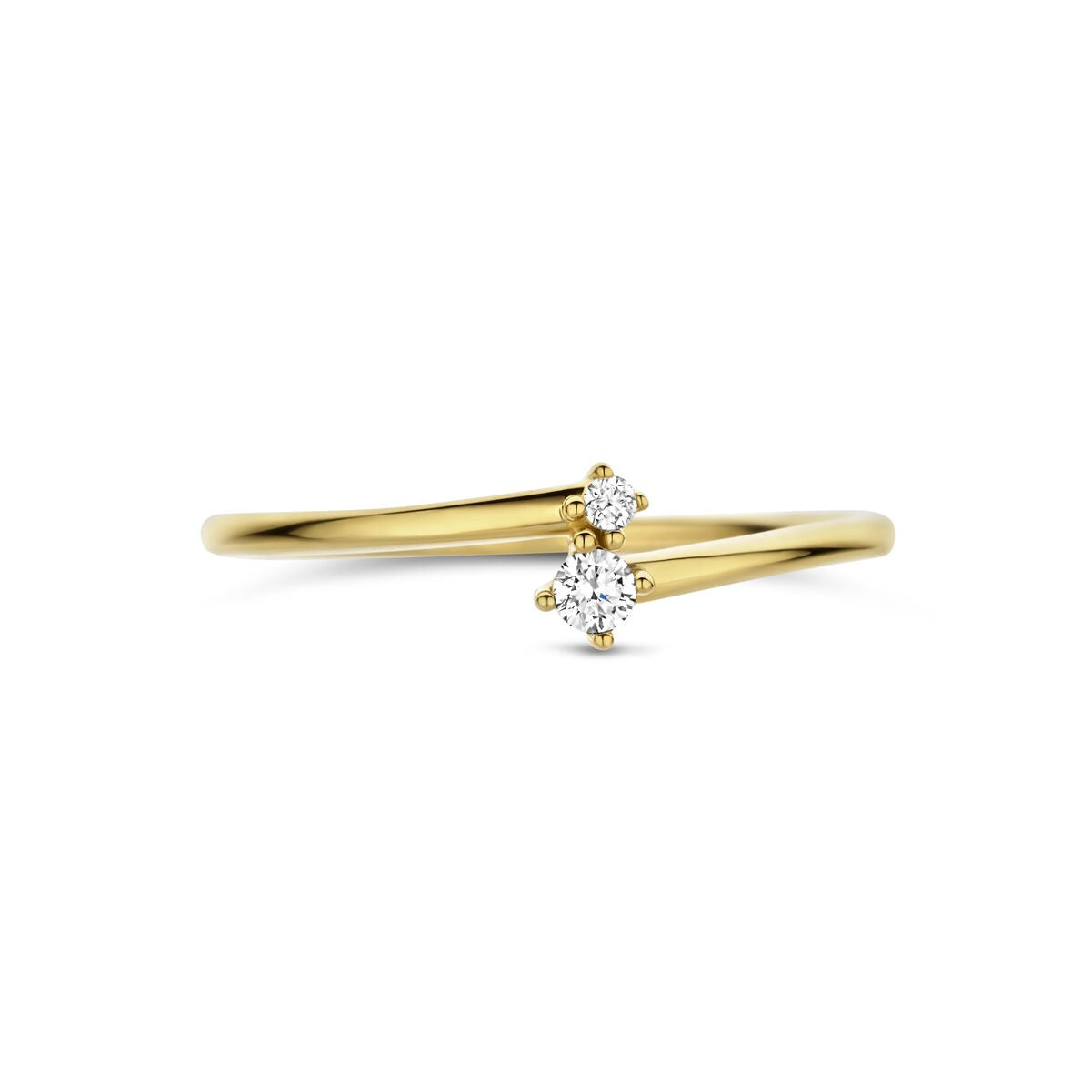 Met een breedte van 5,3 mm is de ring subtiel aanwezig aan de hand, perfect voor dagelijks gebruik maar ook bijzonder genoeg voor een speciale gelegenheid. De combinatie van het warme geelgoud met de heldere schittering van de diamant maakt dit sieraad tot een geliefde keuze voor wie houdt van ingetogen luxe.