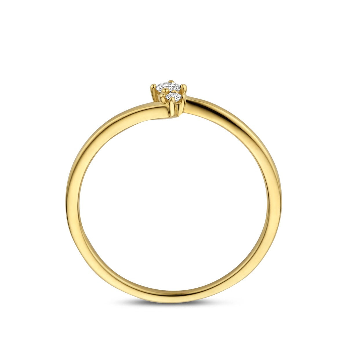 Deze stijlvolle gouden dames ring met diamant is een tijdloos sieraad dat elegantie en verfijning uitstraalt. De ring is vervaardigd uit 14 karaat geelgoud en bezet met een briljant geslepen diamant van 0,06 ct. De steen – met een diameter van 2,5 mm – is zorgvuldig geplaatst in een klassieke vierpoots chatonzetting, waardoor de diamant vrij kan schitteren en het licht prachtig reflecteert.