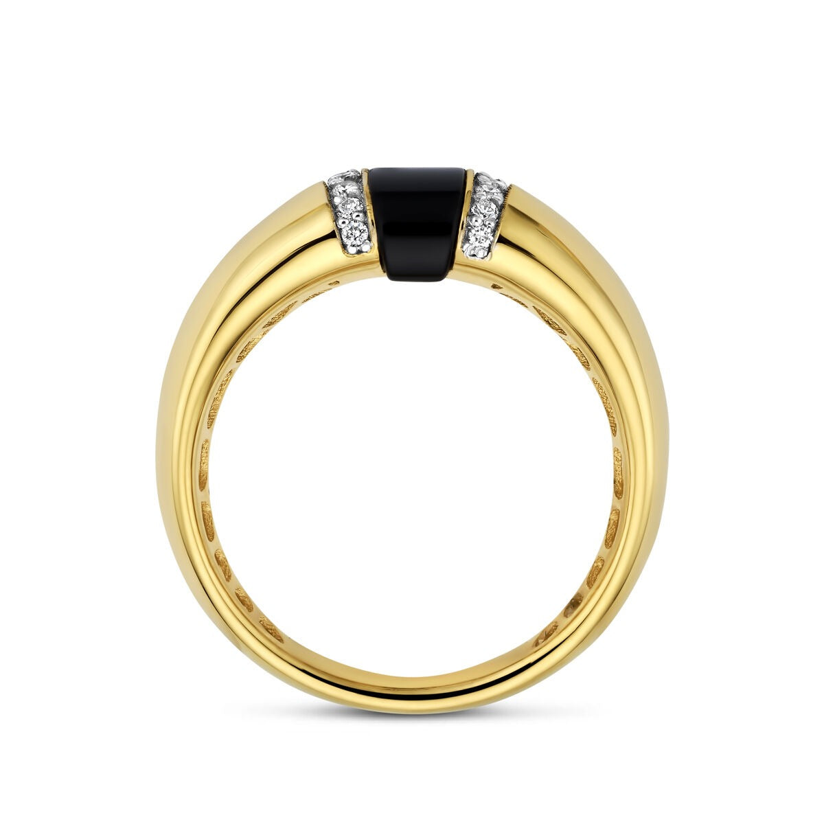 Deze karaktervolle dames ring van 14k geelgoud is een verfijnd spel van contrast en elegantie. De combinatie van diepzwarte onyx met fonkelende diamanten (totaal 0.10 ct, SI2) creëert een krachtige, maar stijlvolle uitstraling. De briljant geslepen diamanten zijn strak in een rijzetting geplaatst, wat zorgt voor een schitterend lijnenspel in het ontwerp.