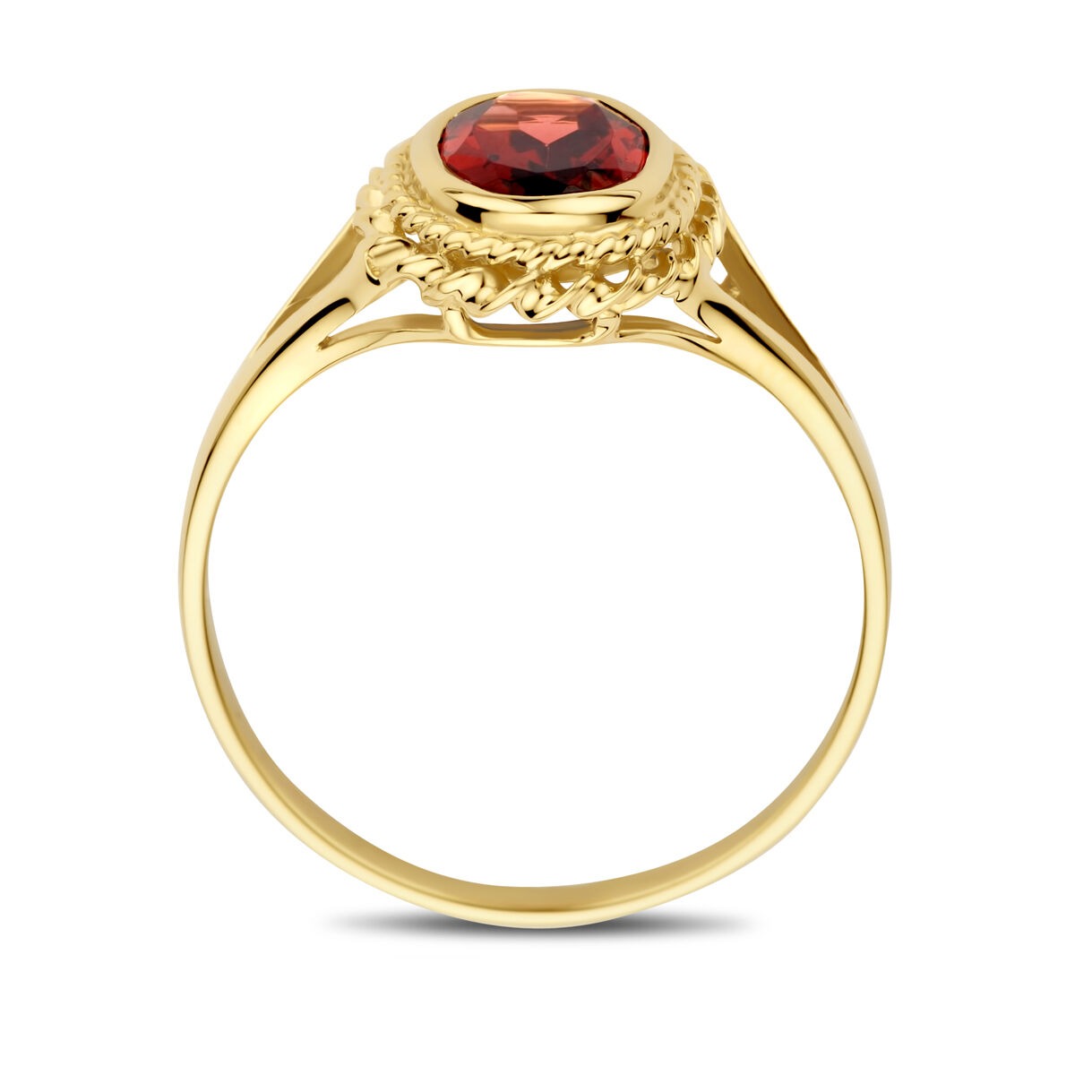 Deze elegante damesring is vervaardigd van hoogwaardig 14 karaat geelgoud en straalt een warme, klassieke luxe uit. Centraal in het ontwerp ligt een dieprode granaat in ovale slijpvorm, die prachtig contrasteert met het rijke goud. De edelsteen is geplaatst in een zetkast, wat zorgt voor een verfijnde omlijsting en een veilige, duurzame zetting waarin de kleur en glans van de granaat optimaal tot hun recht komen.