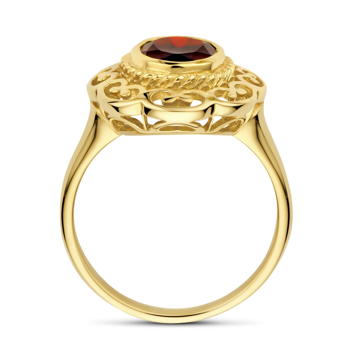 Deze indrukwekkende vintage ring is vervaardigd van hoogwaardig 14 karaat geelgoud en straalt karakter, elegantie en ambacht uit. Centraal in het ontwerp ligt een dieprode granaat in ovale slijpvorm, die door zijn warme kleur een prachtig contrast vormt met het rijke goud. De steen is gezet in een klassieke zetkast, wat niet alleen zorgt voor een veilige en duurzame zetting, maar ook het authentieke vintage gevoel van de ring versterkt.