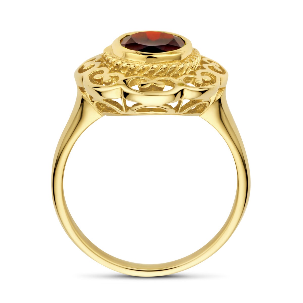 Deze karaktervolle vintage ring is vervaardigd van hoogwaardig 14 karaat geelgoud en straalt een rijke historie en tijdloze elegantie uit. Het ontwerp wordt gedomineerd door een diepe, warmrode granaat in ovale slijpvorm, die prachtig contrasteert met het volle geelgoud. De edelsteen is geplaatst in een klassieke zetkast, wat niet alleen zorgt voor een veilige en duurzame zetting, maar ook het authentieke vintage karakter van de ring versterkt.