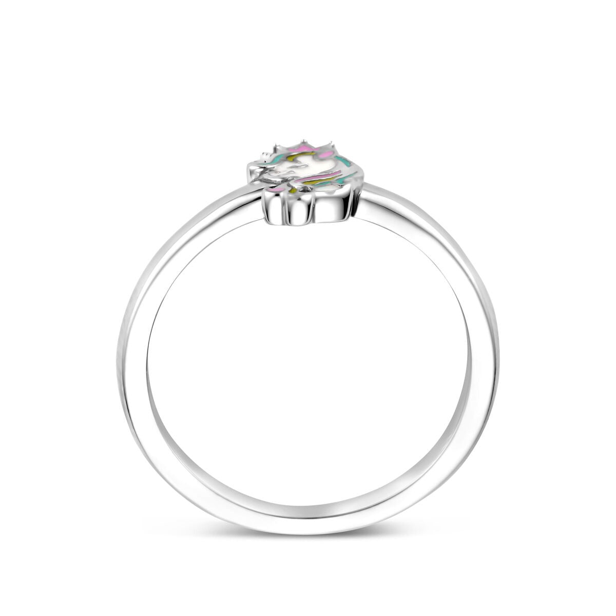 Deze betoverende zilveren kinderring is speciaal ontworpen voor jonge dromers. Het ontwerp toont een kleurrijke eenhoorn in tinten geel, lichtblauw, roze en wit – een speelse en magische verschijning die tot leven komt op een basis van gerhodineerd 925 zilver. Dankzij deze rodiumlaag blijft de ring langdurig glanzend en is hij beter bestand tegen krassen en verkleuring.