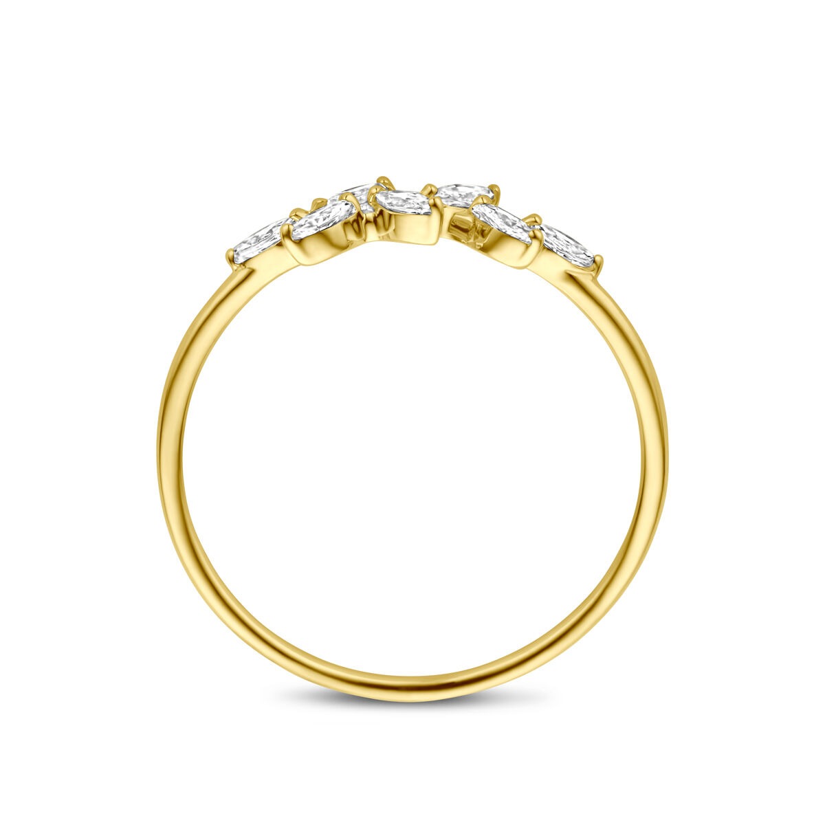 Met een breedte van 4 mm heeft deze ring een mooie balans tussen subtiliteit en aanwezigheid, waardoor hij zowel solo als in combinatie met andere gouden dames ringen prachtig tot zijn recht komt. Het warme geelgoud vormt een stijlvol contrast met de heldere steen, voor een tijdloos geheel.