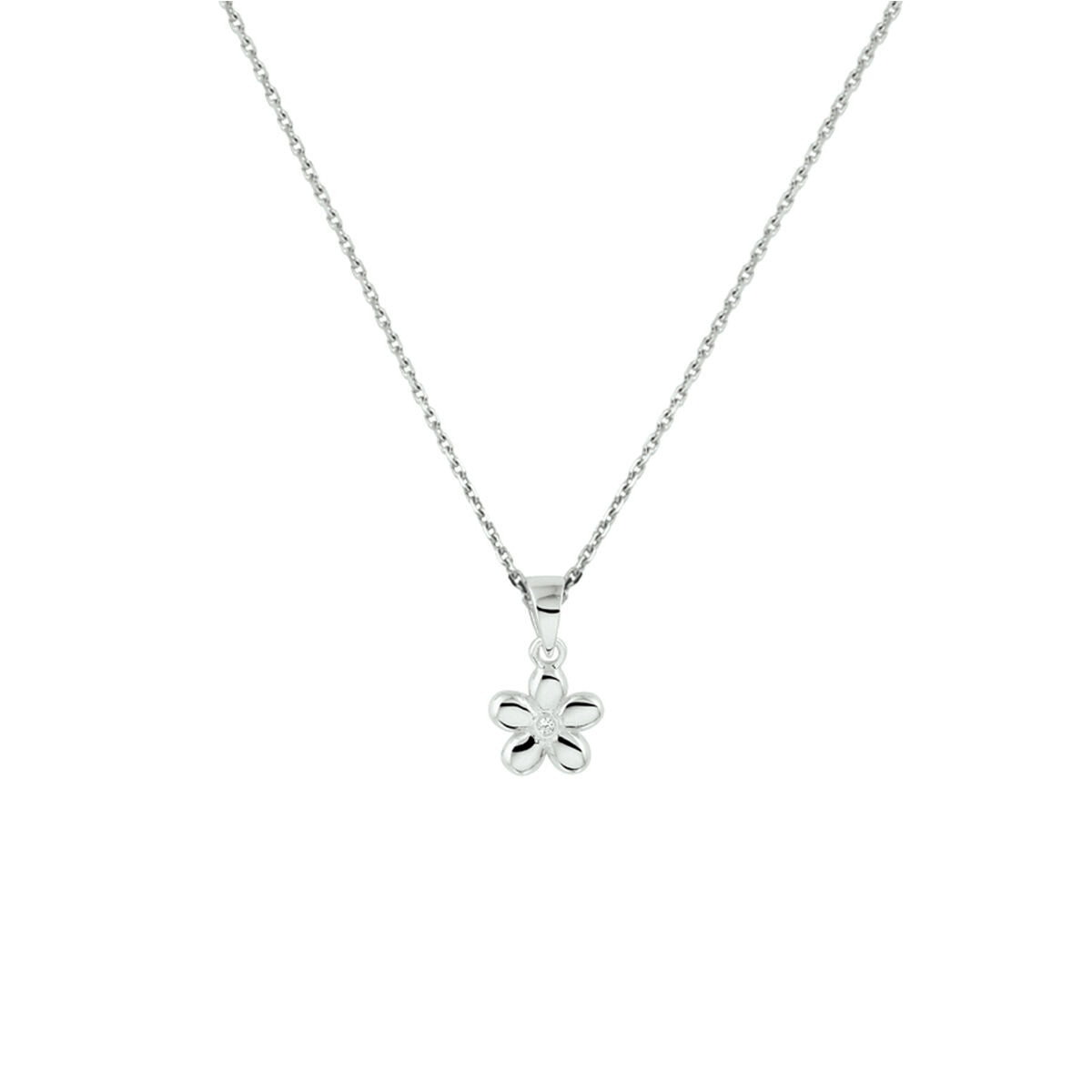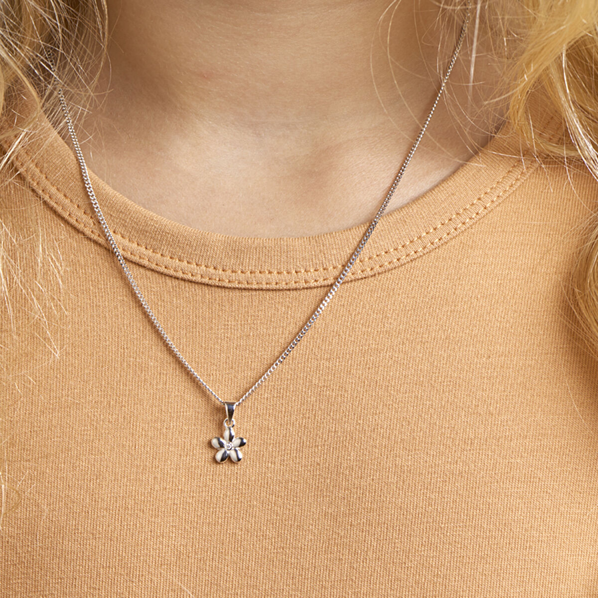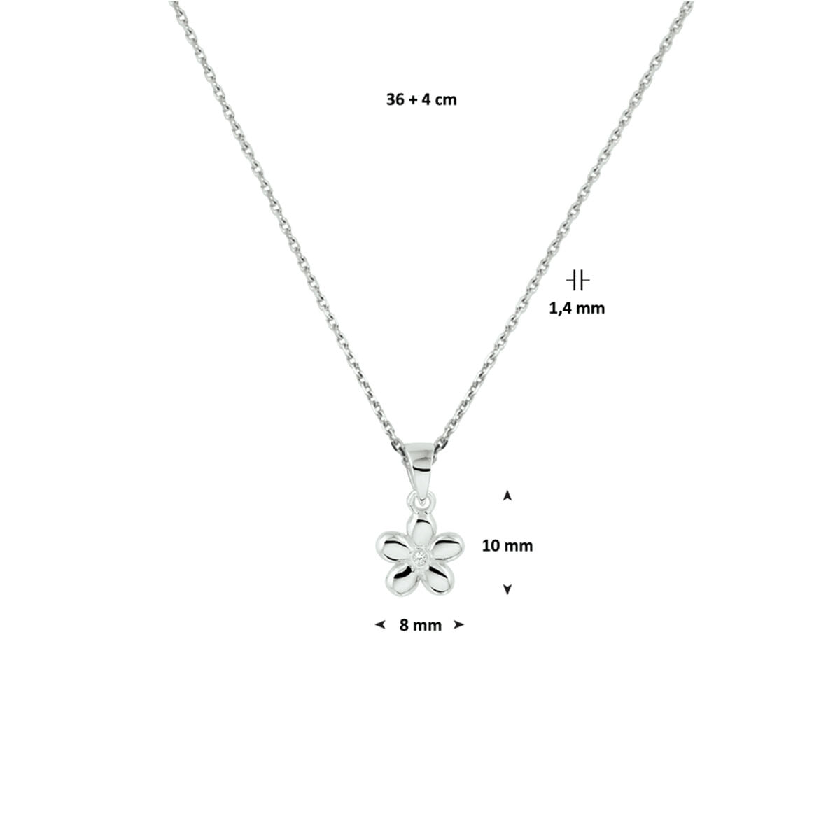 Cute rhodium-plated silver children's necklace with a flower pendant and a beautiful zirconia. The length is 36cm with a 4cm extension and the link width is 1.1mm. Info: Rhodium-plated silver is more resistant to discoloration and scratches due to the rhodium layer.
