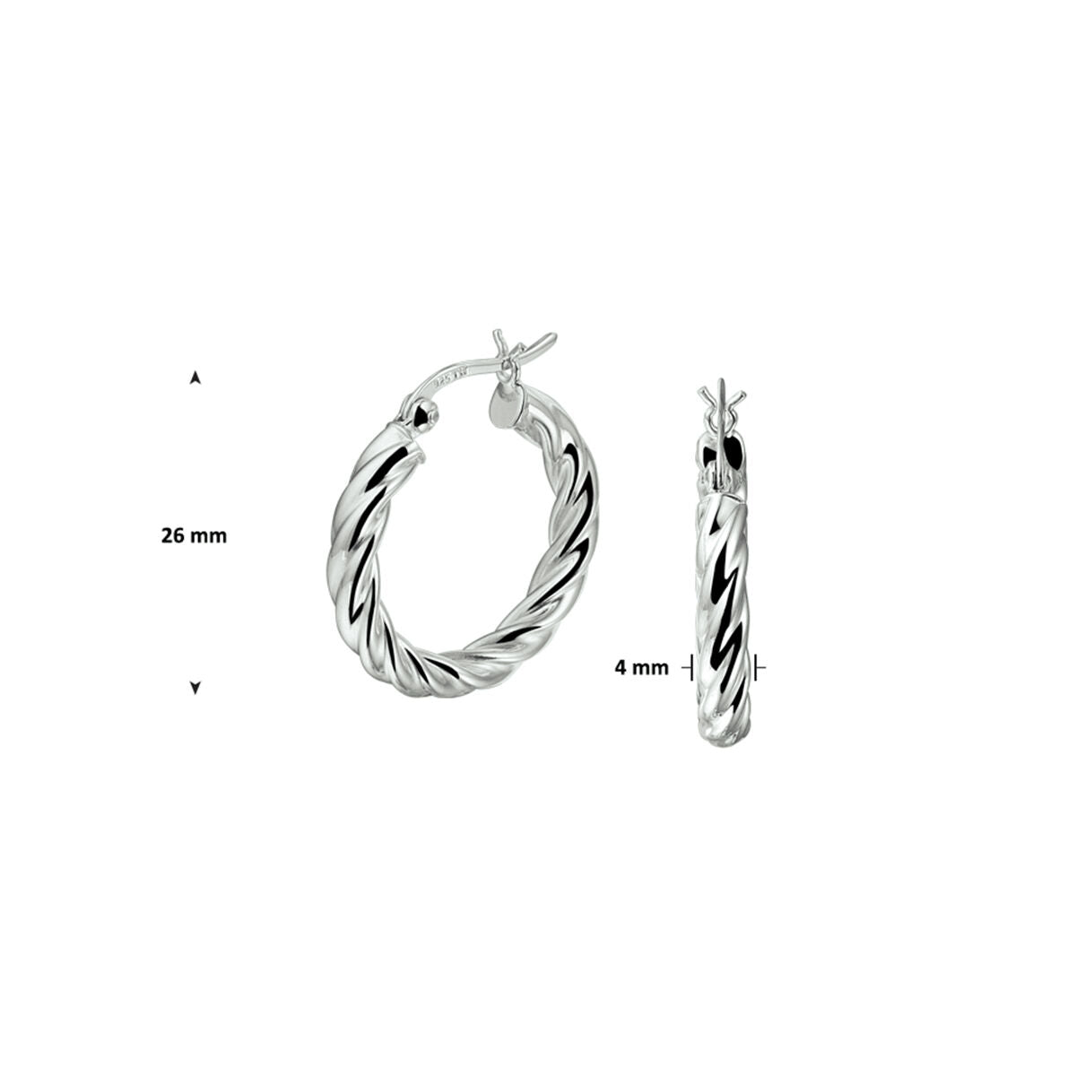 Classic rhodium silver earrings measuring 26x4mm with a twisted tube and a sturdy hinge closure. Info: Rhodium-plated silver is more resistant to discoloration and scratches due to the rhodium layer.