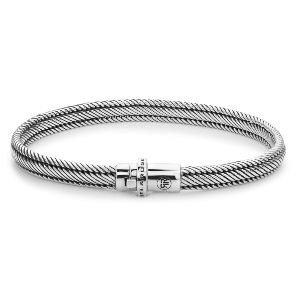 De Demeter Small Six armband van Rebel & Rose is een slank, zilverkleurig gedraaid kabelontwerp gemaakt van 17,11 gram 925 zilver, met een cilindrische sluiting gegraveerd met de merknaam en een cirkelvormig logo tegen een zwarte achtergrond.