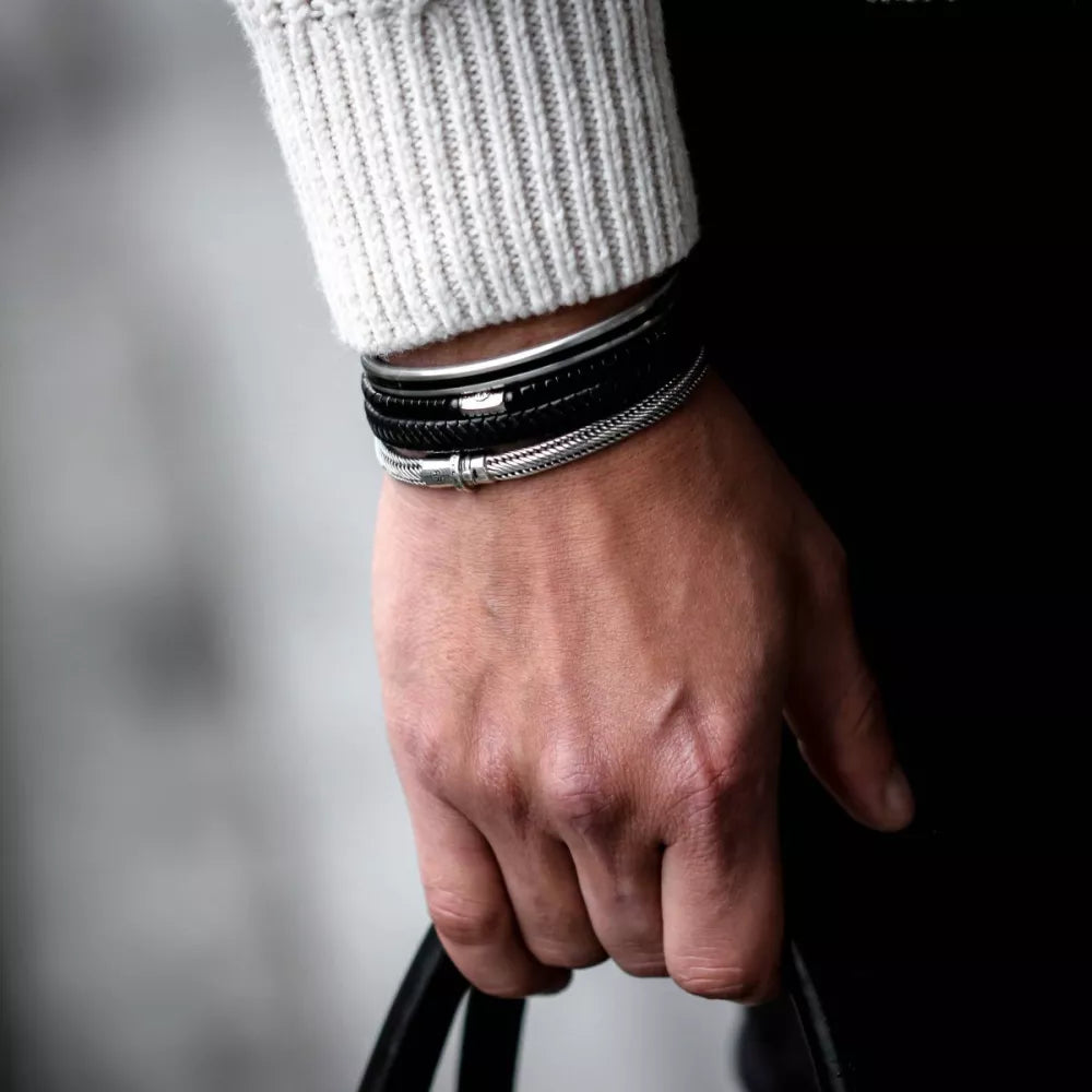 Een close-up van een hand die een zwart bandje vasthoudt, een grijze gebreide trui draagt en meerdere armbanden, waaronder de Rebel & Rose Demeter Small six - 17,11 gr. 925 zilver heren armband. De achtergrond is onscherp.
