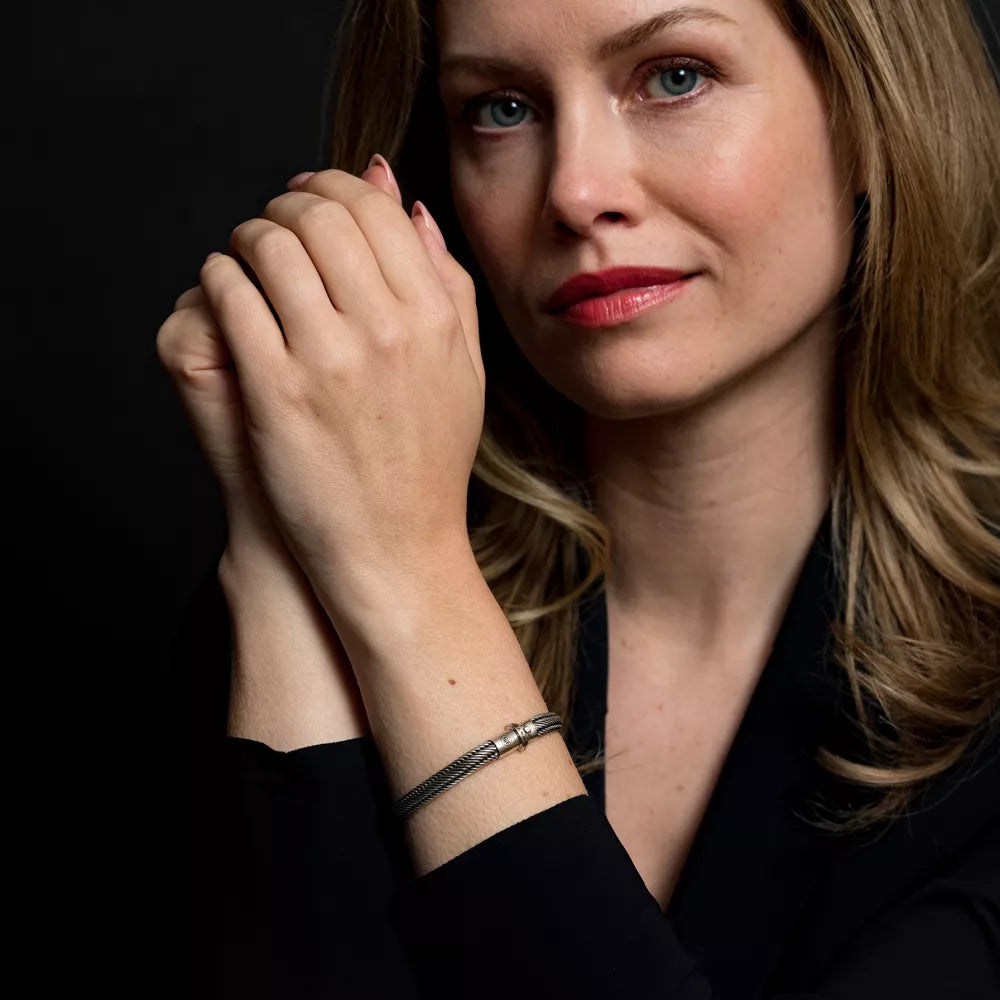 Een vrouw met lichtbruin haar en blauwe ogen poseert tegen een donkere achtergrond, draagt een zwart topje en een Rebel & Rose Demeter Small six - 17.11 gr. 925 armband, haar handen elegant om haar gezicht geklemd.