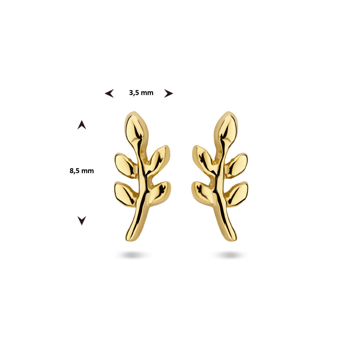 Yellow gold on 925 silver ear studs in the shape of a leaf. The ear studs have a size of 8.5x3.5mm. No guarantee on plating.