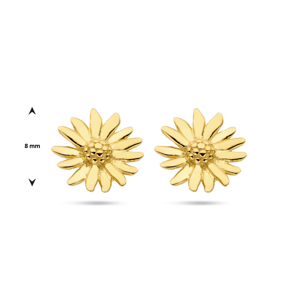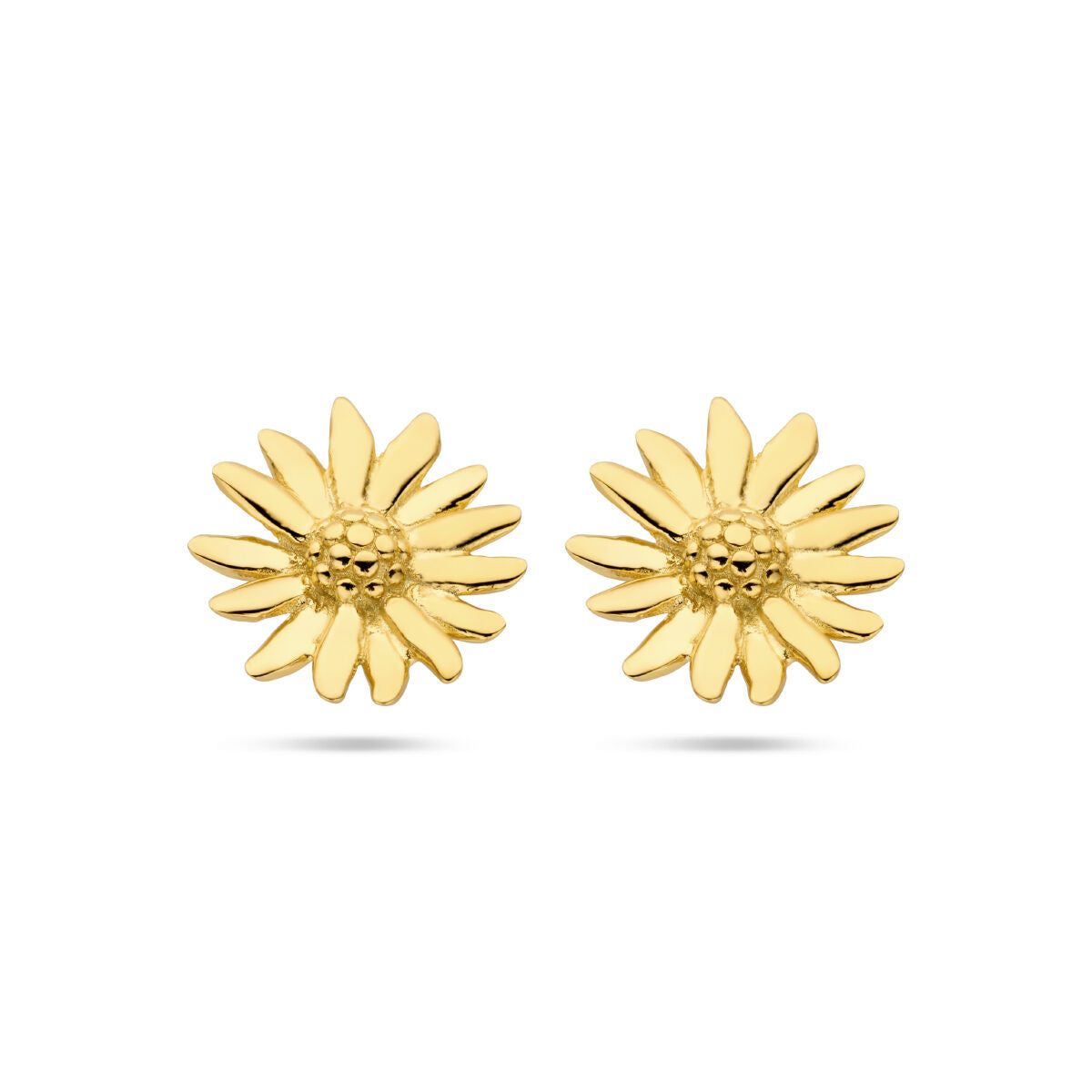 Van der Kooij Collectie oorknoppen madeliefje 1 micron zilver verguld (geel): bloemvormige oorbellen met gedetailleerde blaadjes en een bewerkte kern, getoond van voren en van opzij op een witte achtergrond.