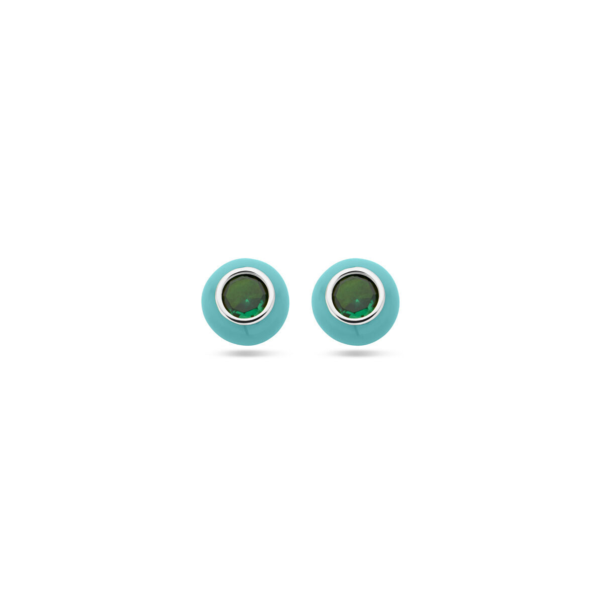 Rhodium-plated 925 silver stud earrings with turquoise enamel and green zirconia. The ear studs have a diameter of 5.5mm.