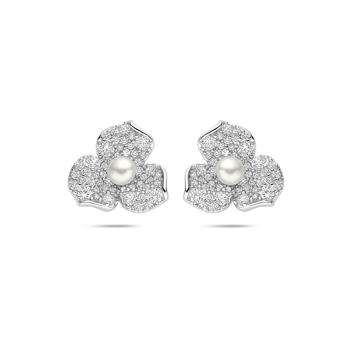 Zilveren oorknoppen met bloemmotief, zirkonia en parel – gerhodineerd 925 zilver