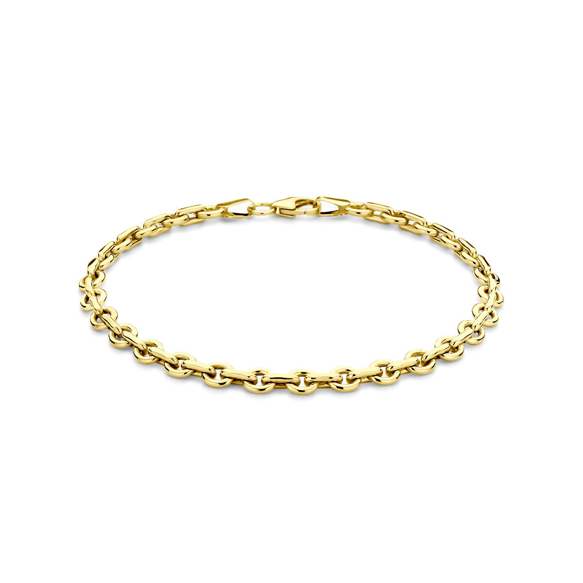 Met een breedte van 4,5 mm en een lengte van 19 cm valt deze armband mooi om de pols. De klassieke anker schakelstructuur zorgt voor een tijdloos silhouet, perfect te dragen als solo statement of gelaagd met andere gouden dames armbanden. De stevige karabijnsluiting garandeert een veilige pasvorm.