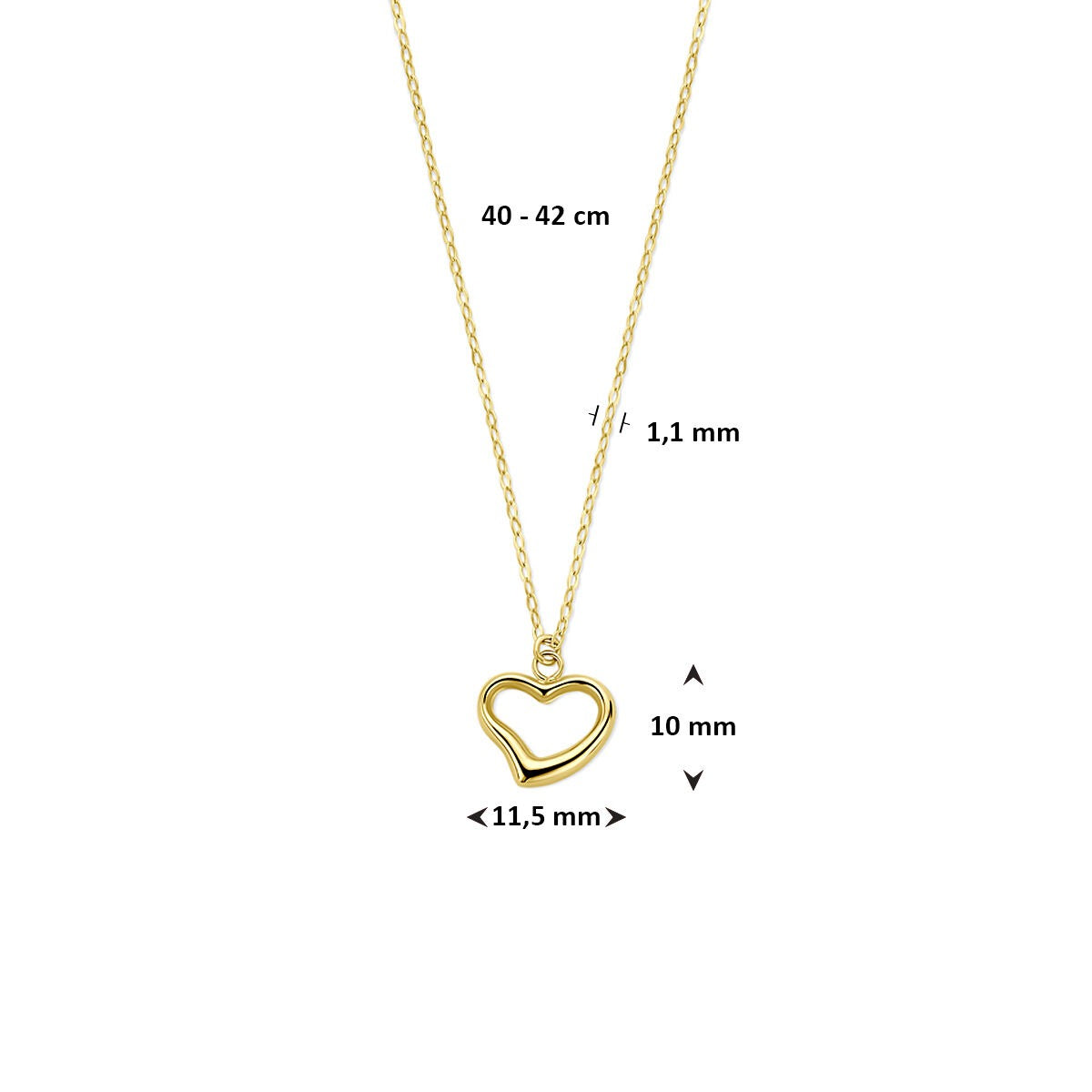 Dit 14k geelgouden ketting met hartje is een verfijnde ode aan de liefde, elegant en betekenisvol vormgegeven. Het hartje van 11,5 x 10 mm hangt subtiel aan een fijne anker schakelketting van 1,1 mm breed, die soepel en elegant om de hals valt. De warme glans van het goud onderstreept de romantische uitstraling, zonder te overdrijven.