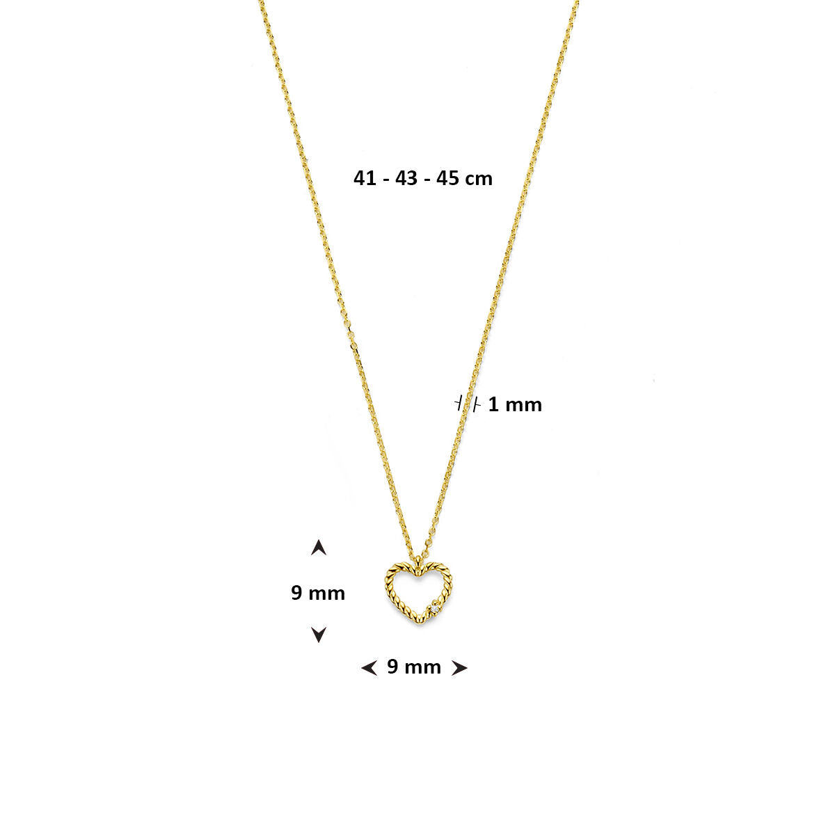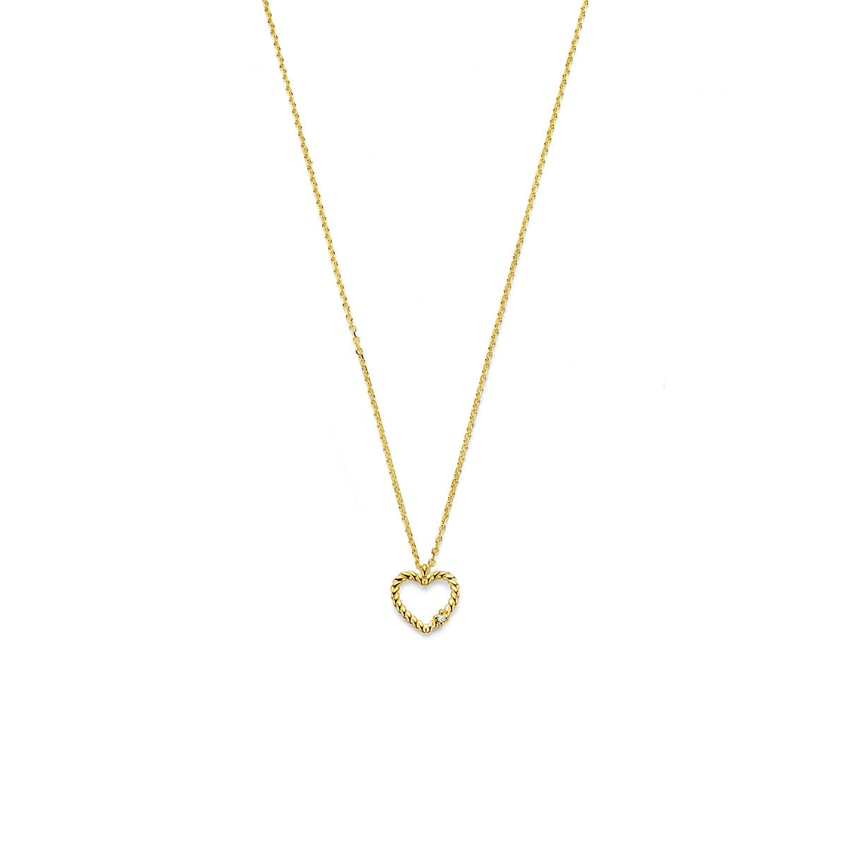 Dit verfijnde 14k geelgouden collier is een subtiel symbool van liefde, uitgevoerd met een elegant hartje en een fonkelende briljant geslepen diamant. De transparante diamant van 0.01 ct, gezet in een delicate chatonzetting, voegt een sprankelende touch toe zonder zijn ingetogen karakter te verliezen.
