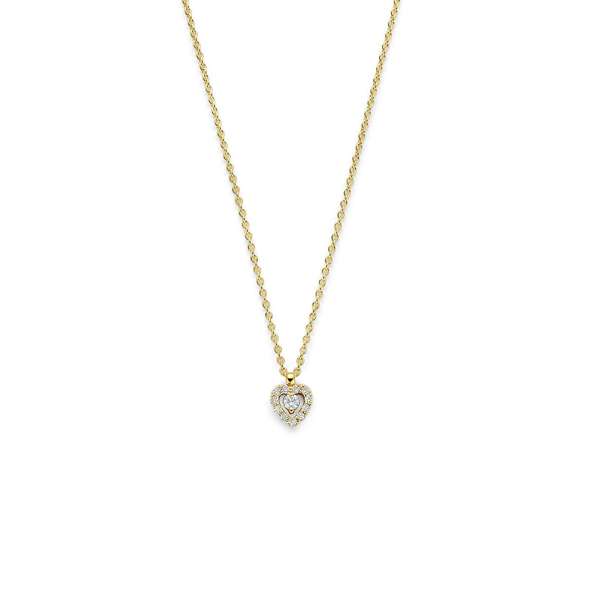 Dit 14 karaat geelgouden collier is een verfijnde ode aan de liefde. Het middelpunt van het sieraad is een sierlijk hartje van 5,5 x 5 mm, bezet met een briljant geslepen diamant van 0.08 ct (SI1-kwaliteit), die schittert in een klassieke chatonzetting. De combinatie van het warme goud en de heldere diamant straalt pure elegantie en symboliek uit – een perfect geschenk voor Valentijn of een bijzonder moment.