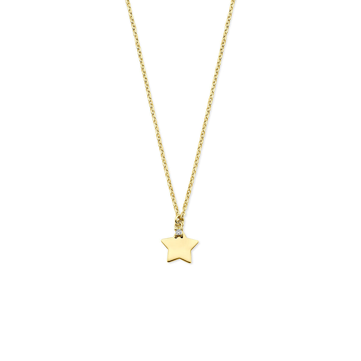 Een stralende blikvanger met een speelse knipoog naar de sterrenhemel: dit 14k geelgouden collier met stervormige hanger en fonkelende zirkonia is een betoverende toevoeging aan elke sieradencollectie. De briljant geslepen steen is klassiek gezet in een chaton, waardoor de transparante zirkonia prachtig tot haar recht komt in het hart van de ster.