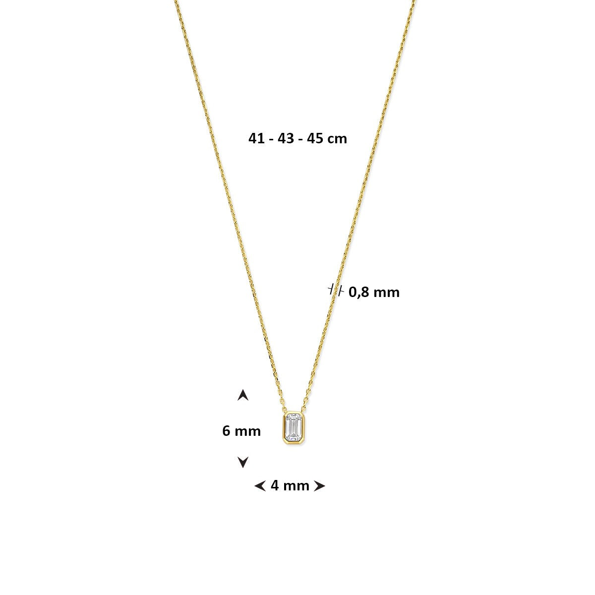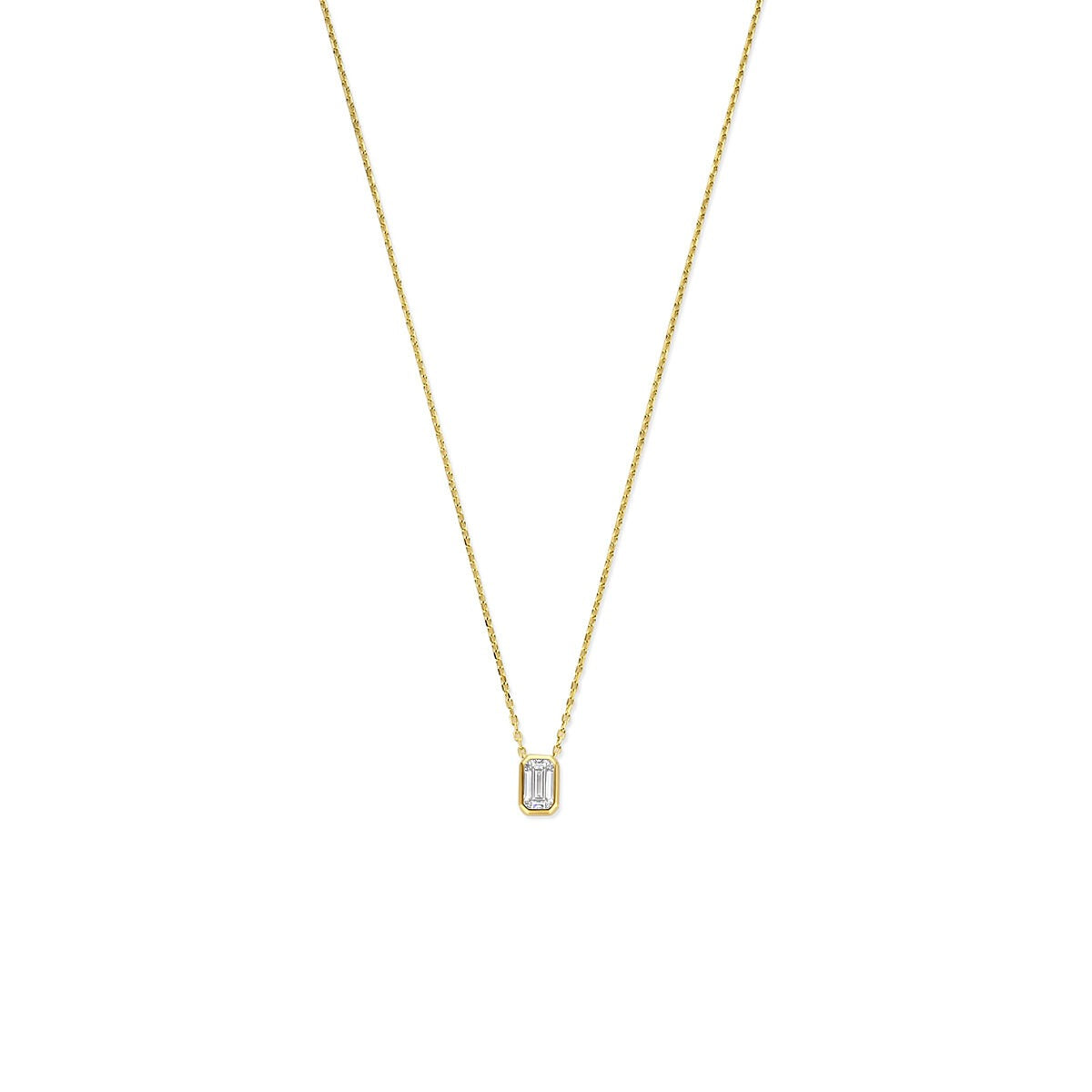 Dit verfijnde 14k geelgouden collier met zirkonia is een subtiele blikvanger die elegantie en moderne finesse moeiteloos combineert. Centraal aan de fijne anker schakelketting van 0,8 mm schittert een transparante emerald geslepen zirkonia (4 x 6 mm), gezet in een elegante zetkast die de geometrische vorm prachtig accentueert.