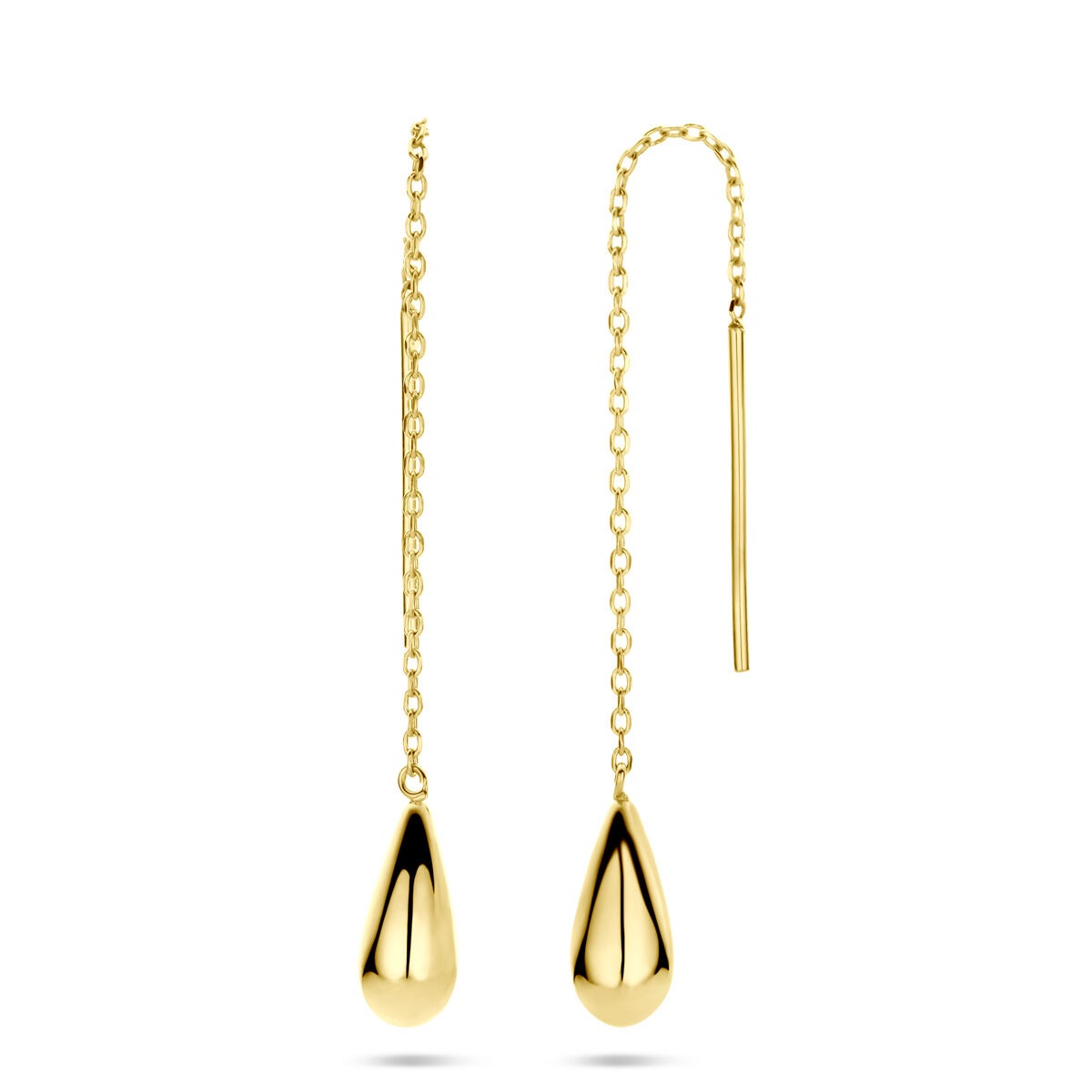 Deze 14k geelgouden doortrekoorbellen zijn een subtiele blikvanger met een eigentijdse charme. Het verfijnde ontwerp, waarbij het sieraad sierlijk door het oor valt, geeft een luchtige en moderne uitstraling. Aan het uiteinde van het fijne kettinkje hangt een gestileerde druppelvormige hanger van 4,5 mm breed en 11,5 mm hoog – elegant en vrouwelijk in zijn eenvoud.