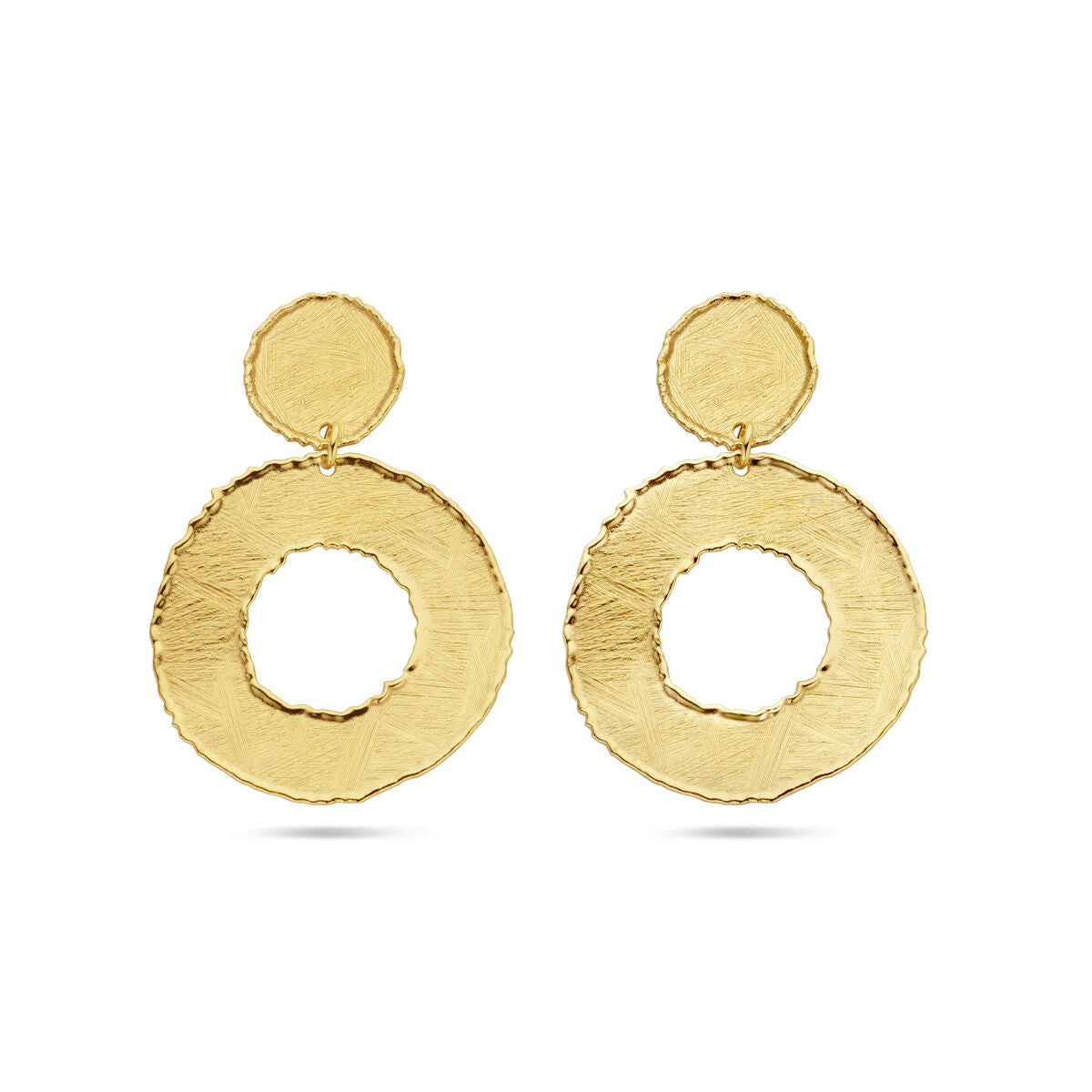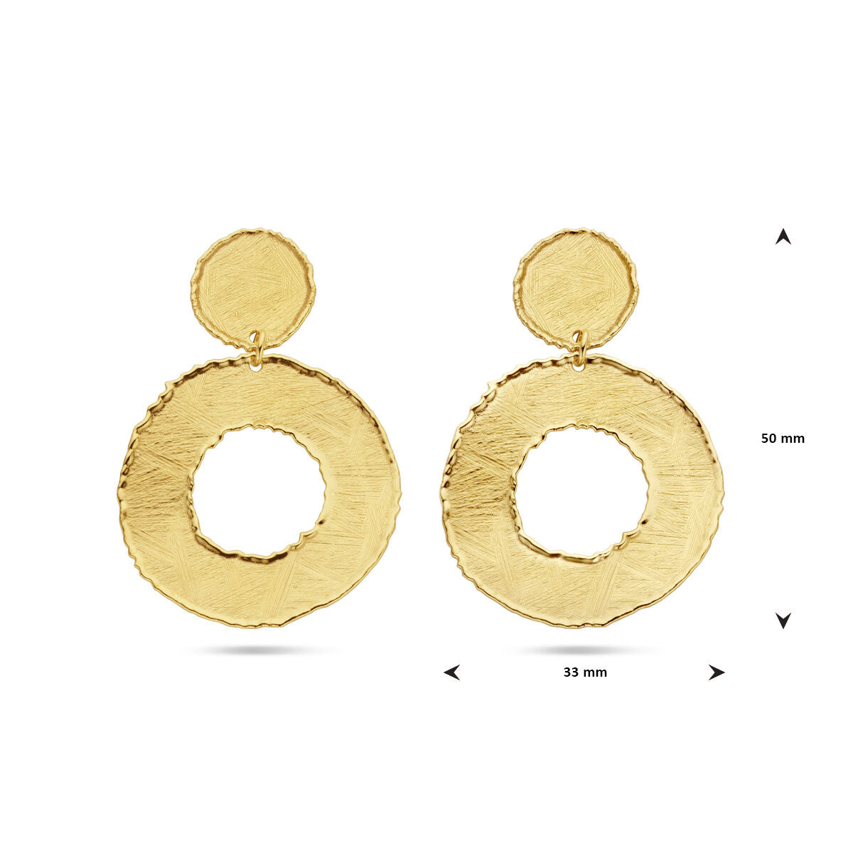 925 zilver vergulde gescratcht oorhangers uitgevoerd met cirkels van 15mm en 33mm. De oorhangers hebben een totale hoogte van 50mm.