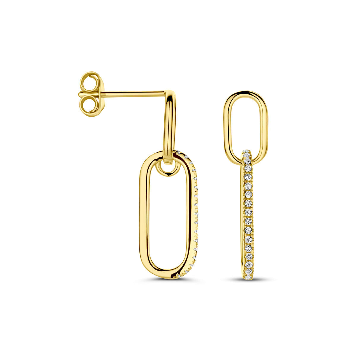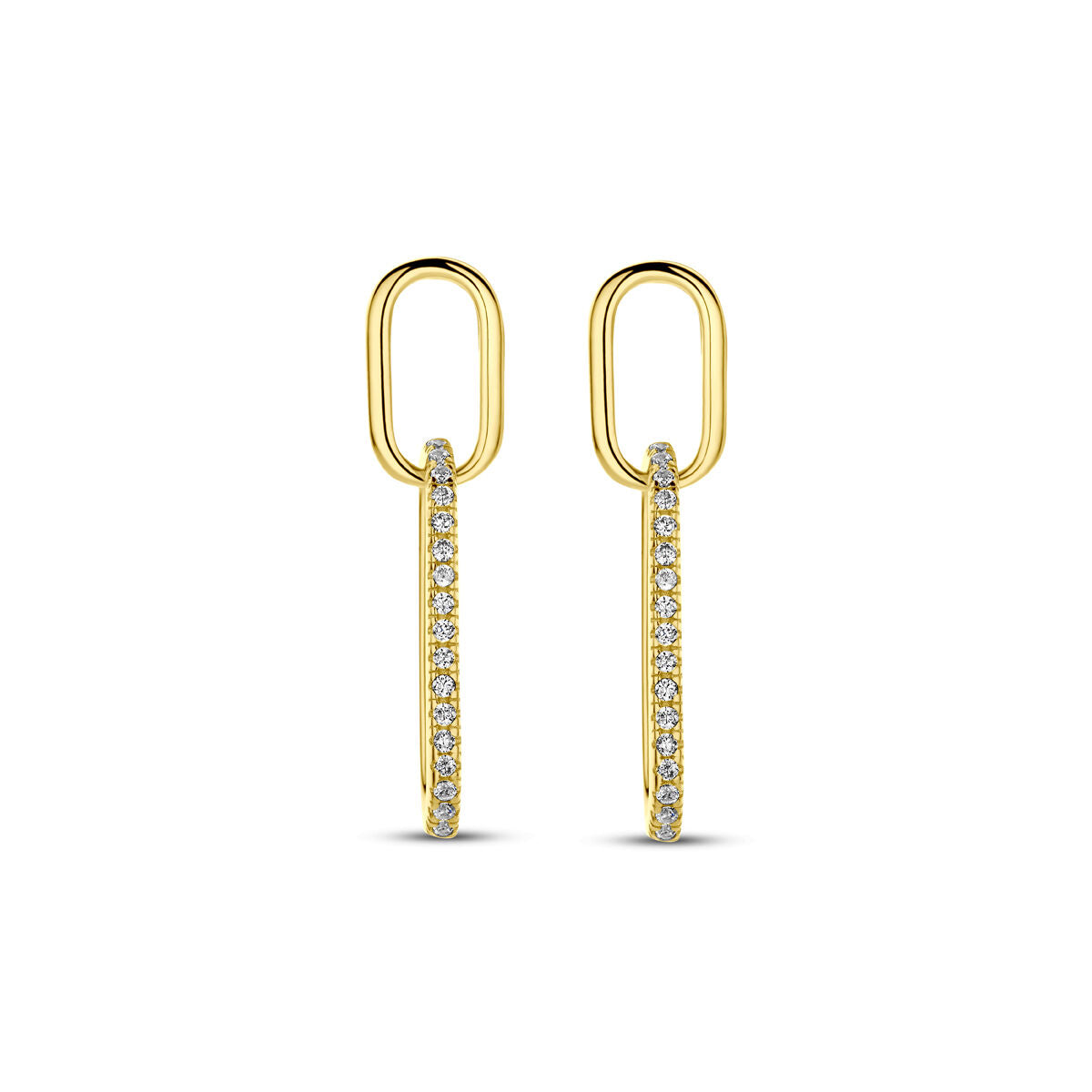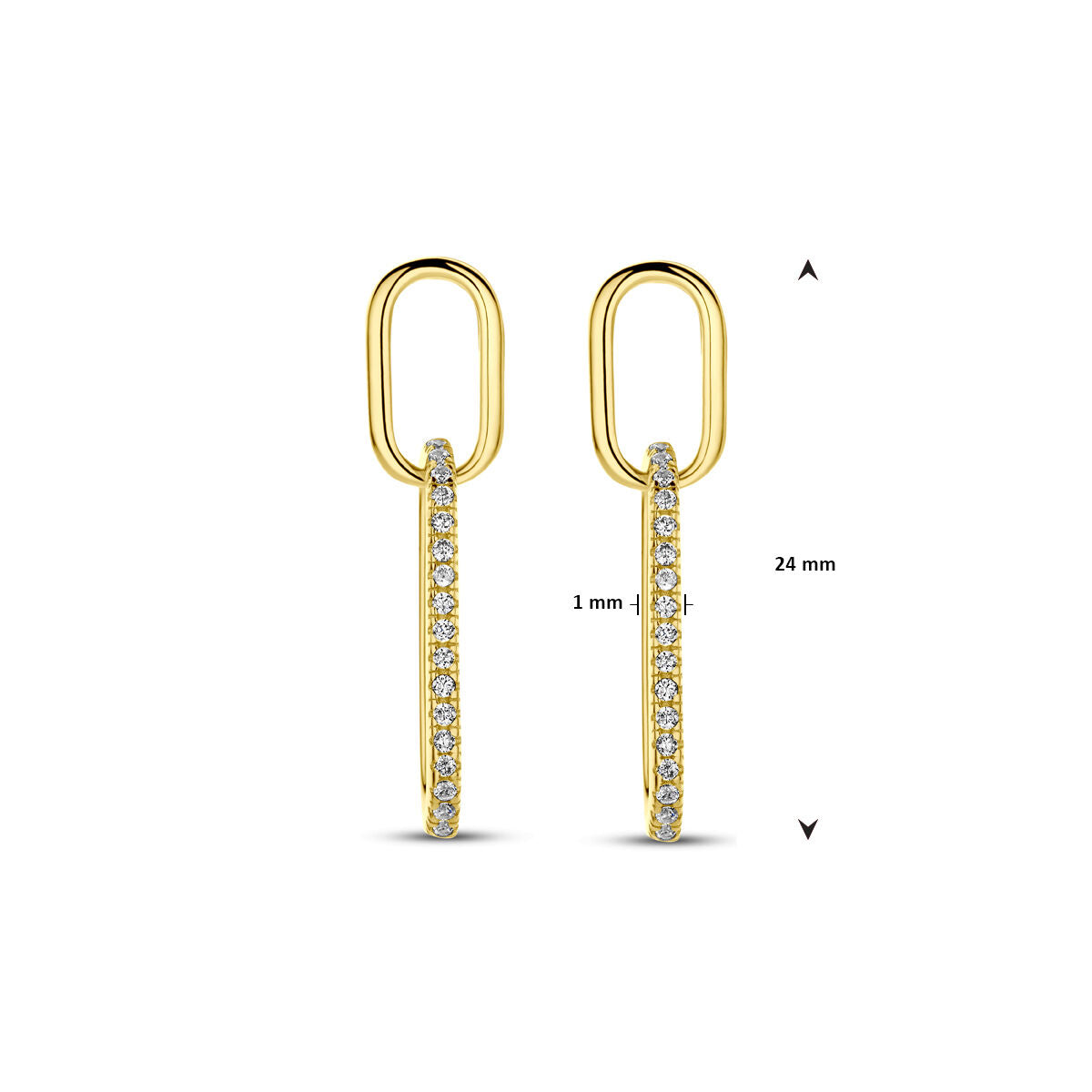 925 zilver vergulde oorhangers uitgevoerd met zirkonia. De oorhangers hebben een totale hoogte van 24mm. Geen garantie op de plating.