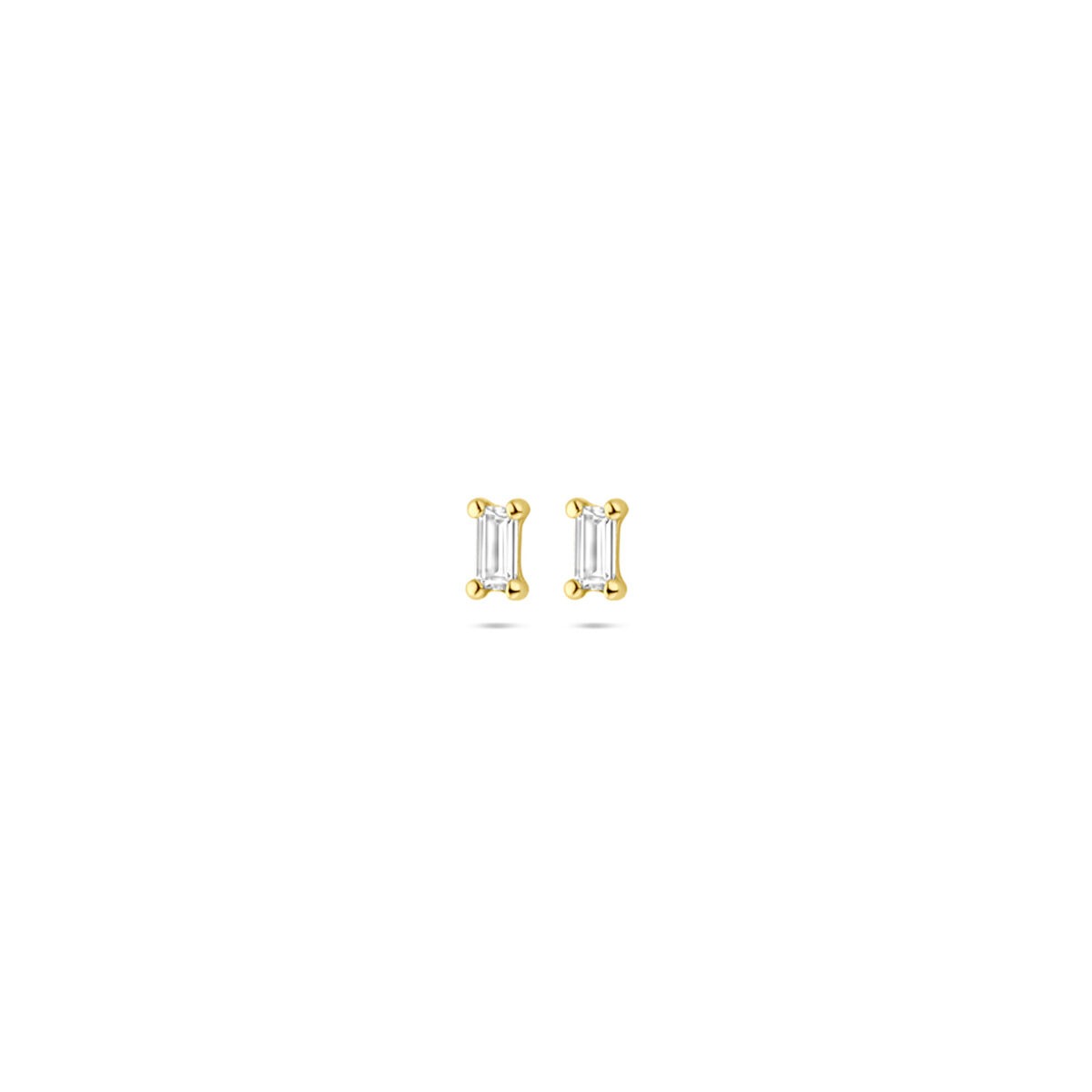 Deze delicate 14k geelgouden oorknoppen zijn bezet met een transparante zirkonia in een elegante emerald slijpvorm. De strakke lijnen van de rechthoekige steen geven dit verfijnde ontwerp een moderne en stijlvolle uitstraling, terwijl de 4-poots chatonzetting het licht optimaal laat spelen voor een subtiele schittering.