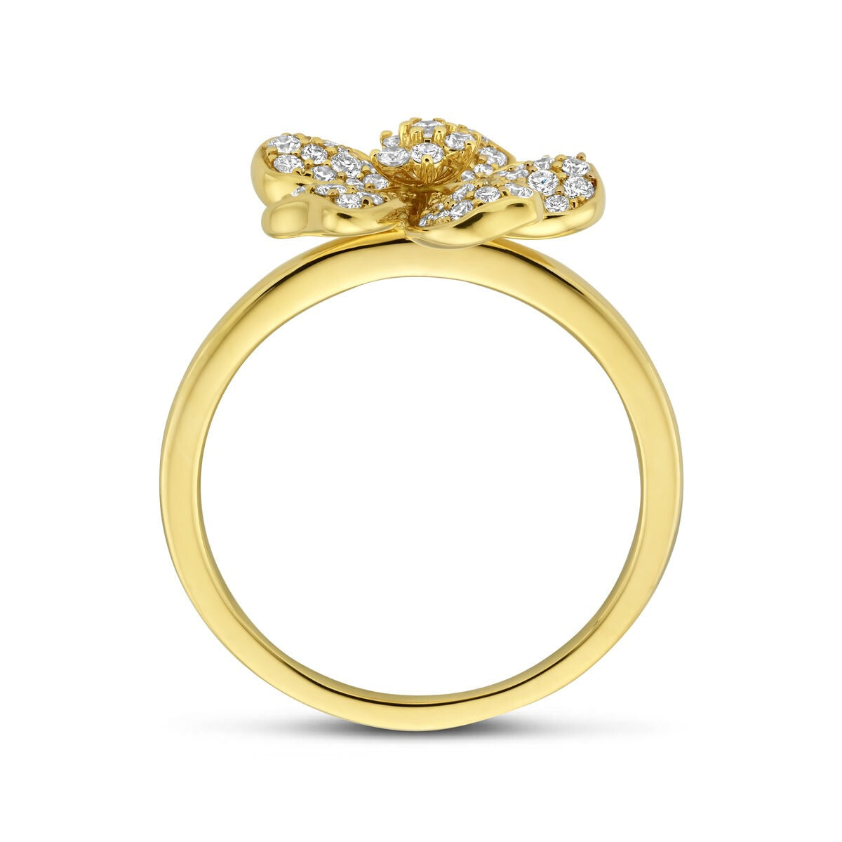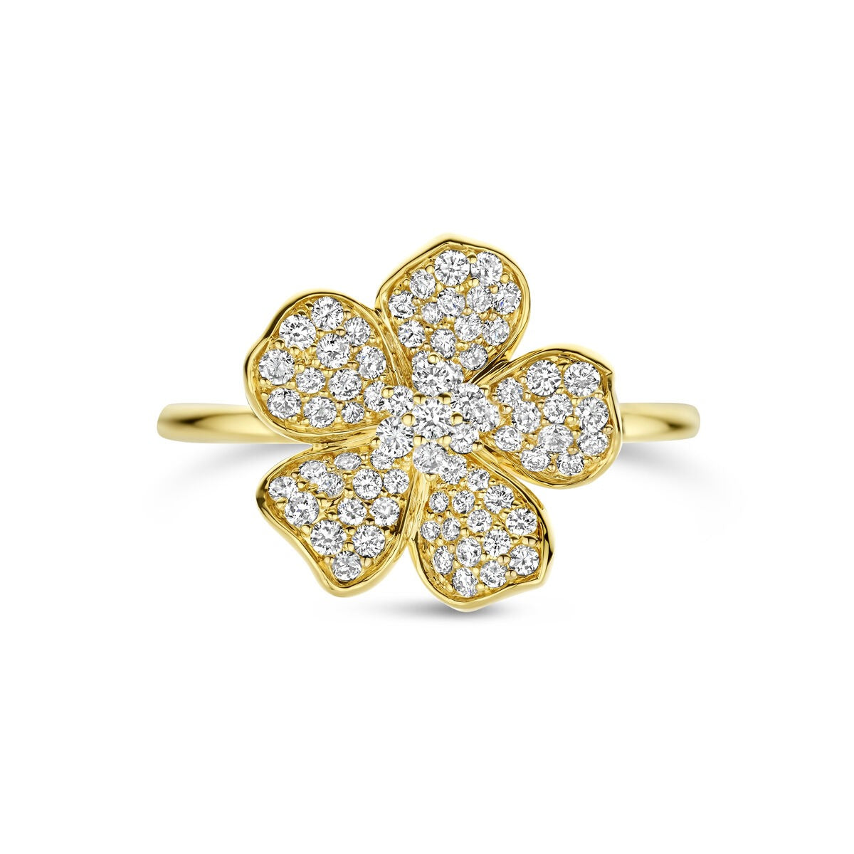 De bloem is rijkelijk bezet met briljant geslepen diamanten in pavézetting, met een totaalgewicht van 0,50 ct en een zuiverheid van SI1. De schitterende diamanten vangen het licht vanuit elke hoek en brengen het ontwerp tot leven. De combinatie van het warme goud en de heldere fonkeling maakt deze ring tot een romantisch statement piece, perfect voor een bijzondere gelegenheid.