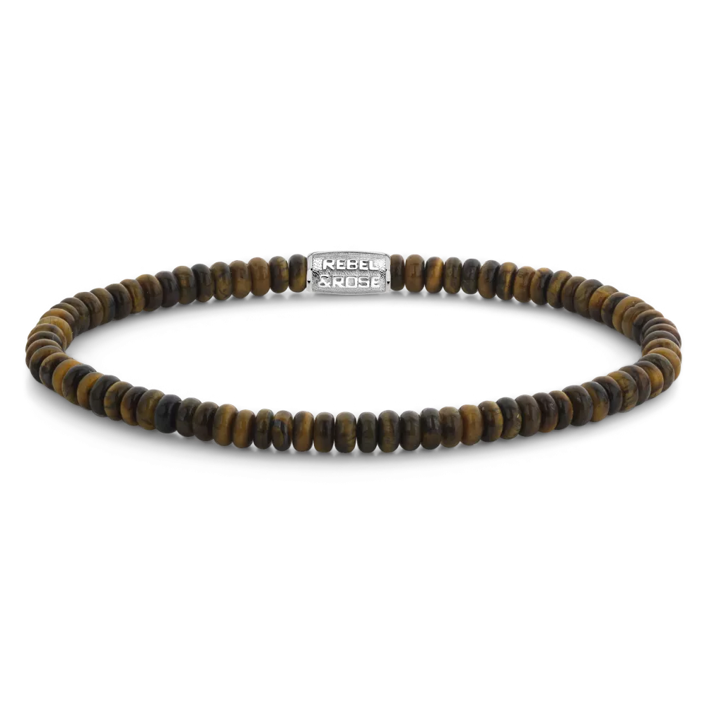 Bead armband, handgemaakt van 4mm Tijgeroog stenen in de vorm van afgeronde slices / schijfjes. De sluiting is zilverkleurig. De slices armbanden laten zich heel makkelijk combineren met andere zilveren, leren of kralenarmbanden. Omdat in deze armband geen ronde stenen zijn gebruikt, heeft de collectie de veelbetekenende naam ‘No balls please’.
