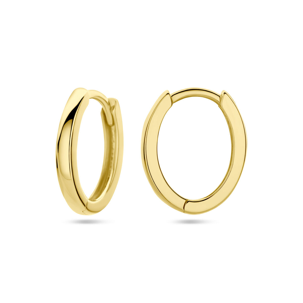 Op een witte achtergrond is een paar klapoorringen in 14 karaat geelgoud uit de Van der Kooij Collectie te zien. De ene oorbel is van voren te zien en de andere van opzij, waardoor het eenvoudige, gepolijste ovale ontwerp wordt benadrukt.