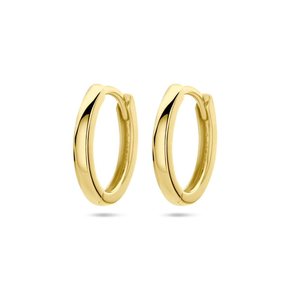 De Van der Kooij Collectie klapoorringen 14K geelgoud zijn kleine, ovaalvormige oorringen met een gladde, gepolijste afwerking: perfecte damesoorbellen voor elke gelegenheid. Weergegeven op een effen witte achtergrond.