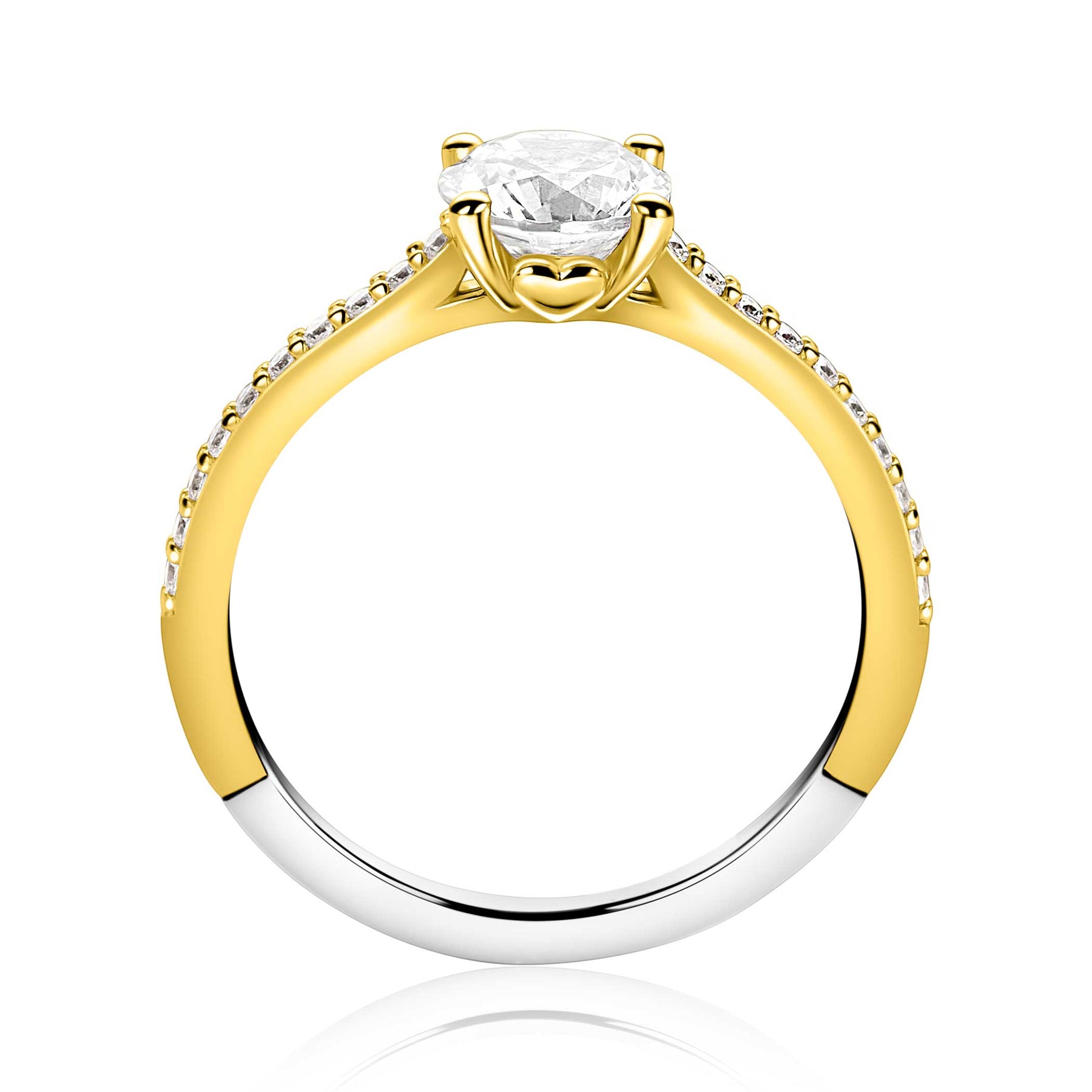 ZINZI gold plated zilveren verlovingsring met een grote ronde witte zirkonia (6,5mm) in vierpootszetting in het midden en kleine witte zirkonia's in de scheen. Leuk detail: het kleine hartje aan de zijkant van de zetting. Vervaardigd van eerste gehalte zilver (925) en extra geel verguld.
