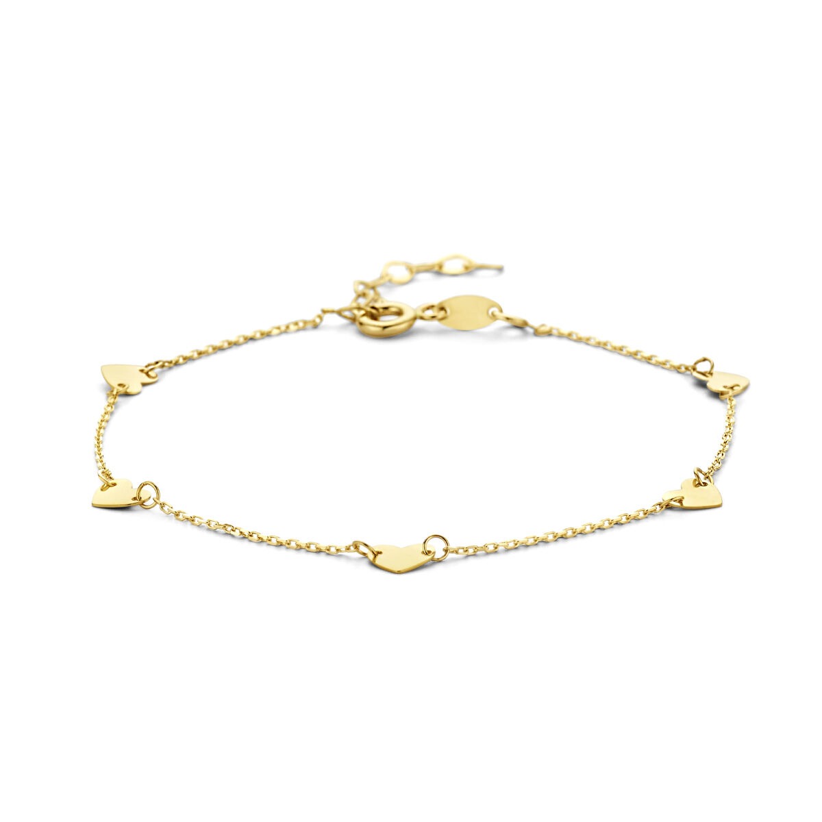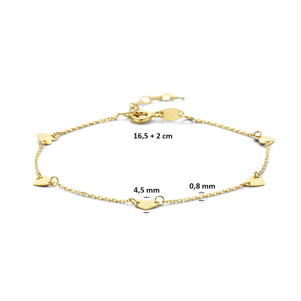 Deze 9 karaat geelkleurige dames armband straalt romantiek en verfijning uit. De fijne anker schakel, met een breedte van slechts 0,8 mm, wordt speels onderbroken door sierlijke hartjes die symbool staan voor liefde en verbondenheid. Door de combinatie van elegantie en betekenis is deze armband een prachtig geschenk voor Valentijn of een ander bijzonder moment.